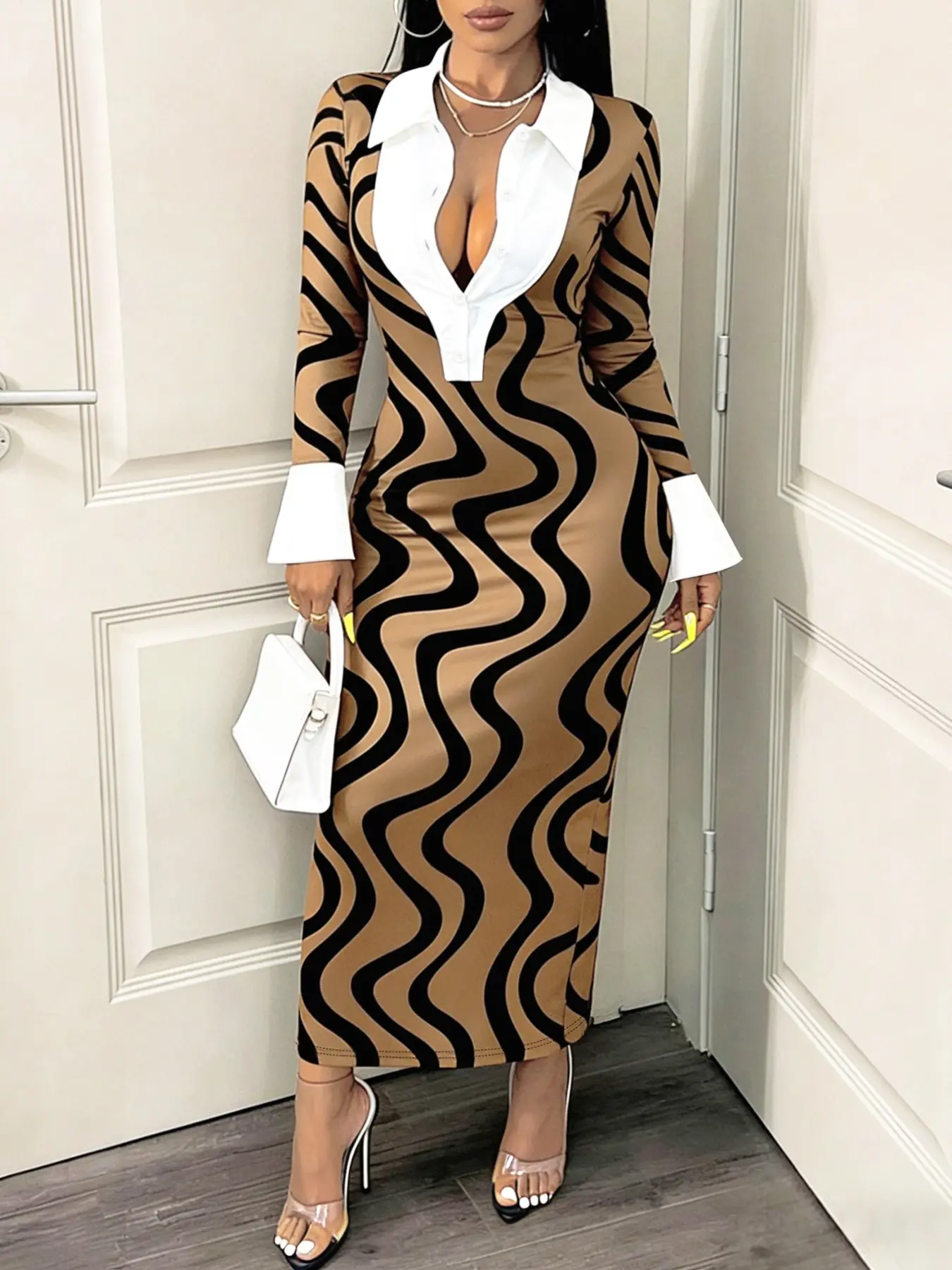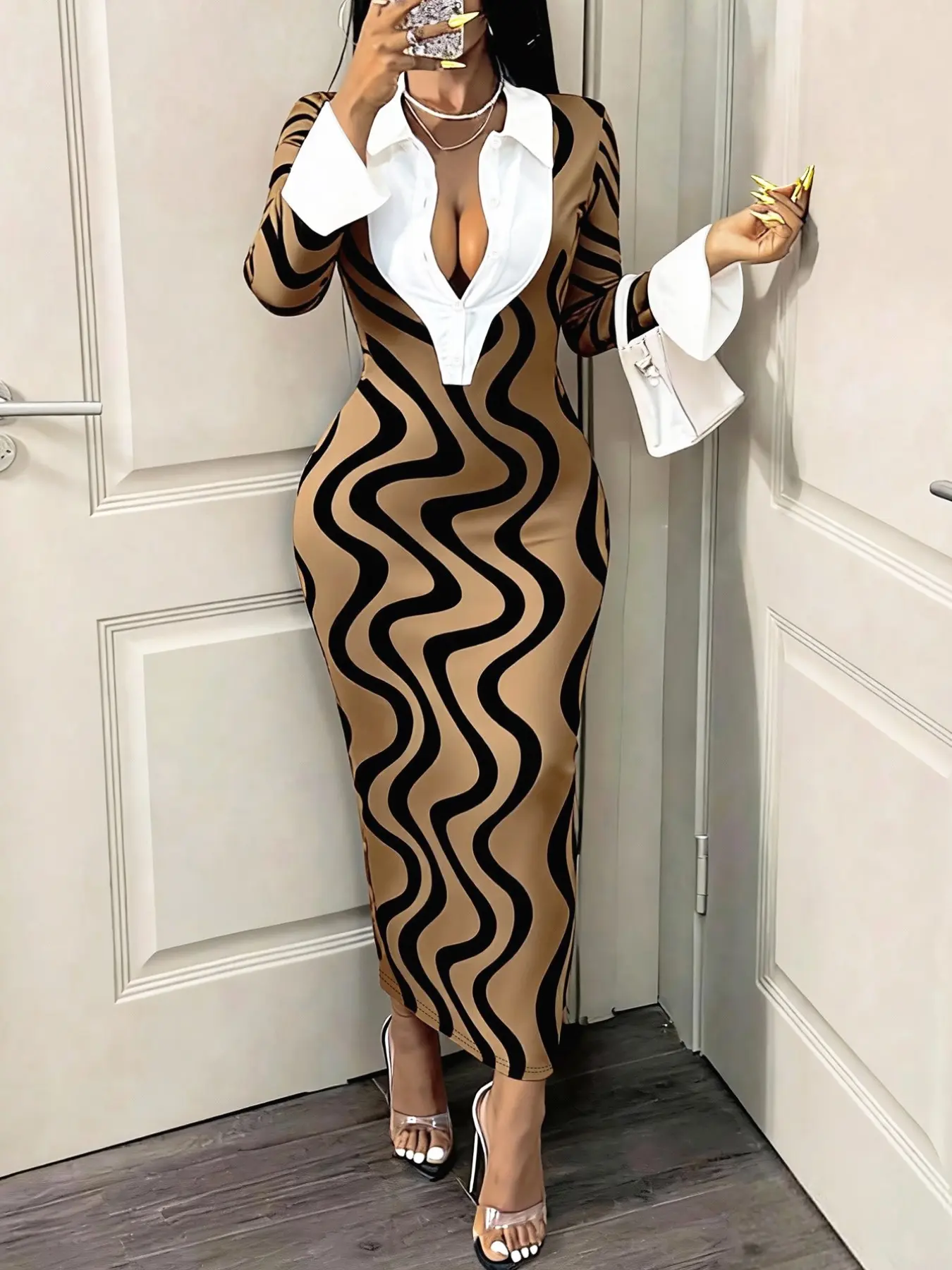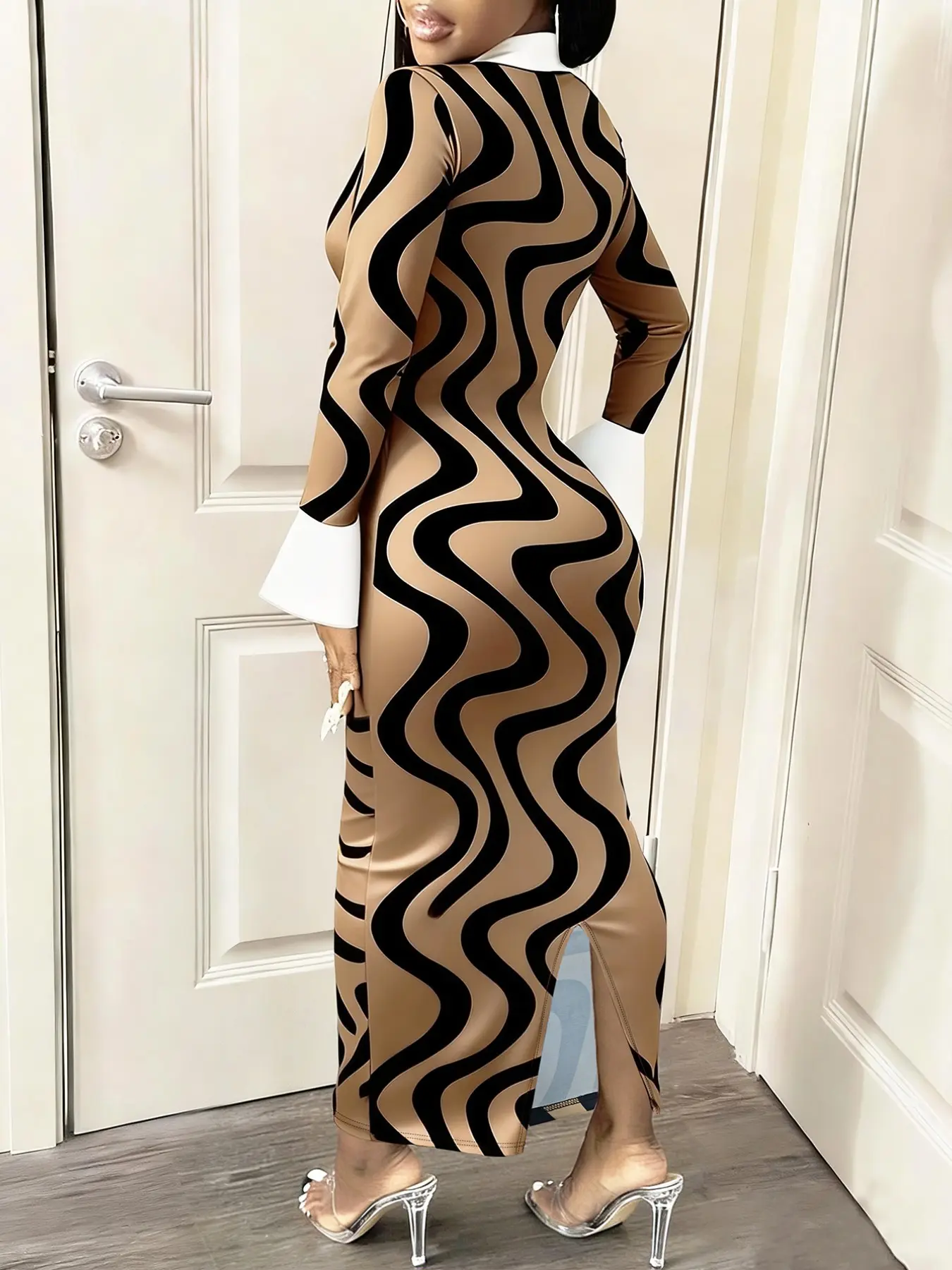 Women's Fashion Colorblock Shirt Collar Patchwork Wave Pattern Dress, Flared Sleeve Fitted Bodycon Long Evening Gown, All Seasons
