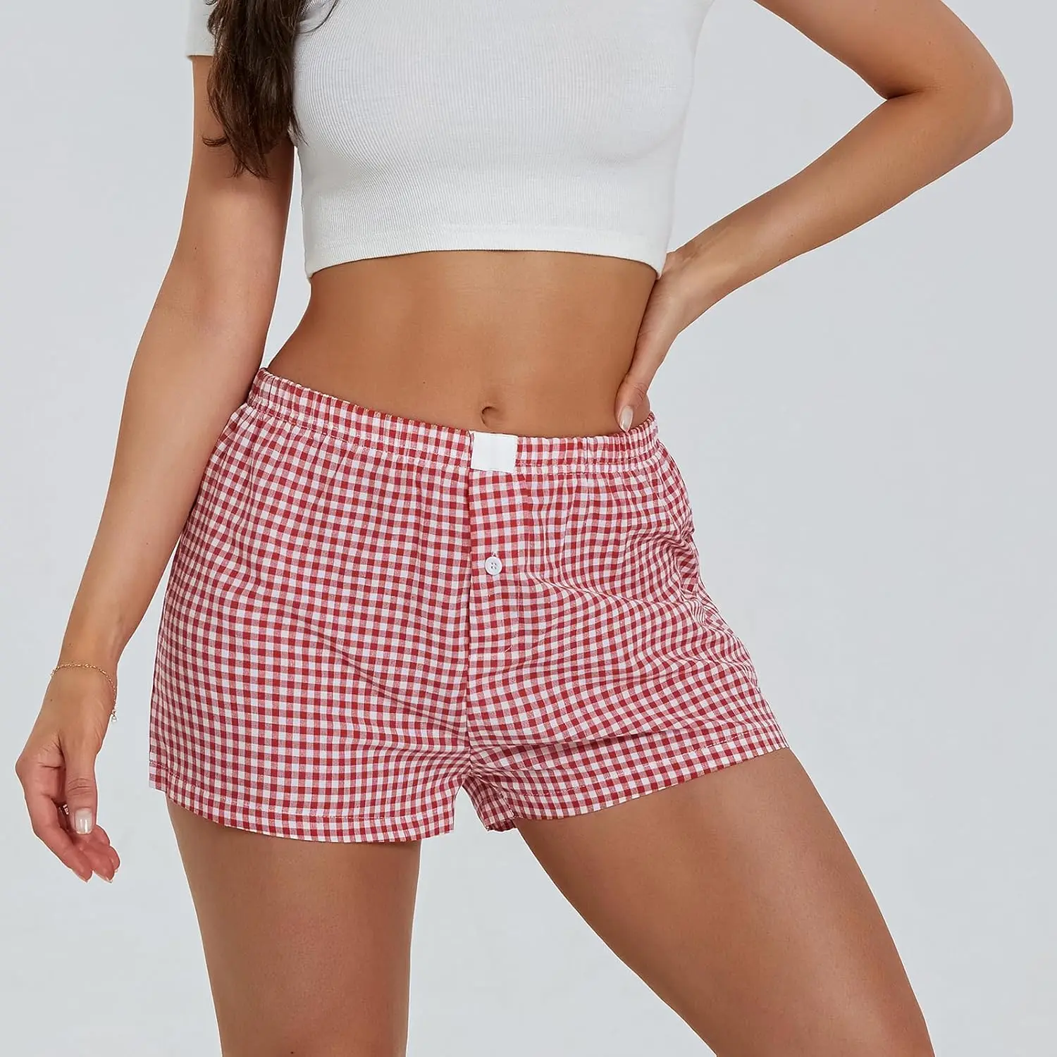 Women's Y2K Pajama Shorts – Gingham Plaid Cute Pj Short Pants, Elastic Waist Boxer Sleep Bottoms for Lounge, Streetwear Summer Sleepwear – Black/White Pink/White