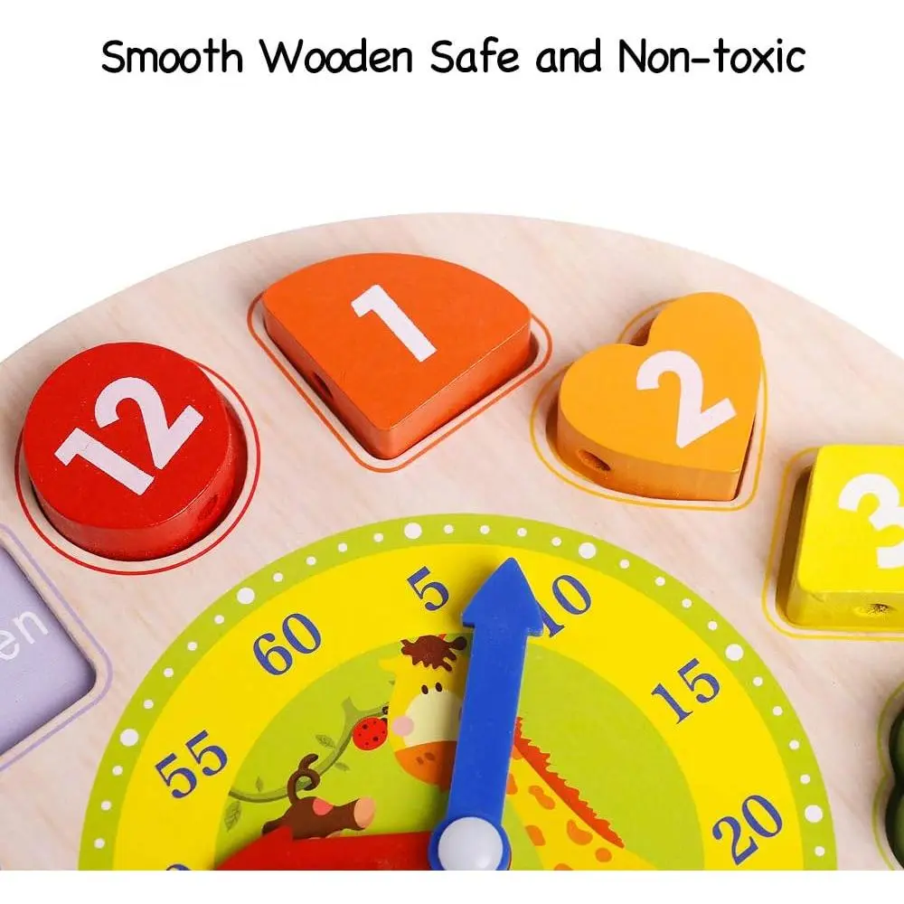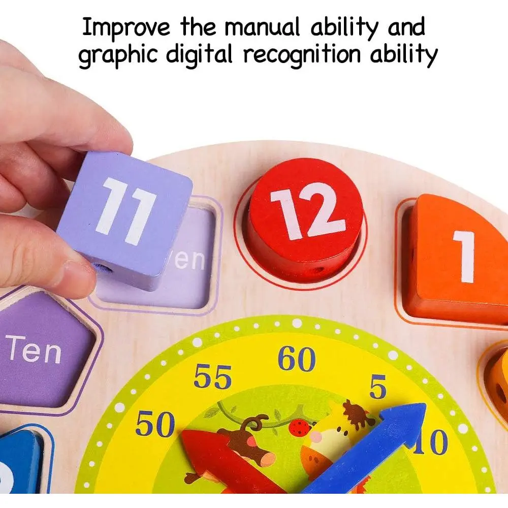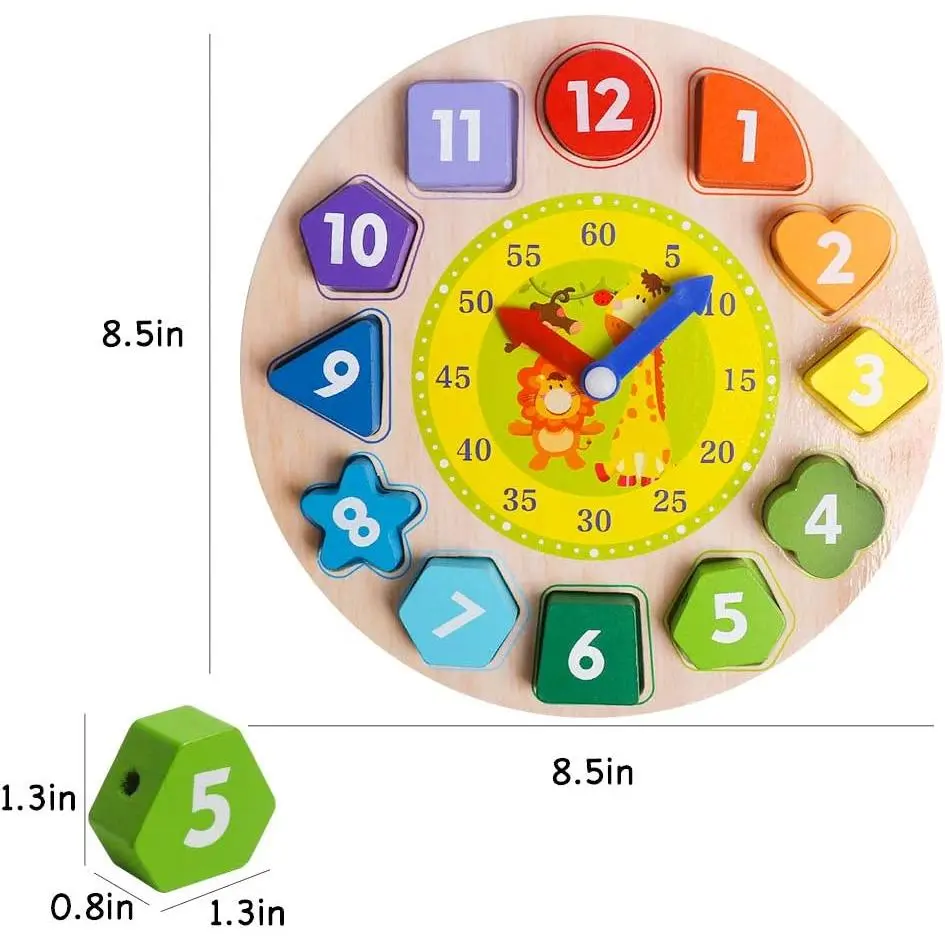A colorful wooden clock with 12 wood blocks that fit into matching slots, and movable hour and minute hands that rotate to encourage realistic practice.The hour and minute hands are printed very clearly, and the hour blocks (1-12) are identified by different colors and numbers, which is very clear and easy for children to recognize.This is a great choice for birthday presents, Halloween and Christmas presents.