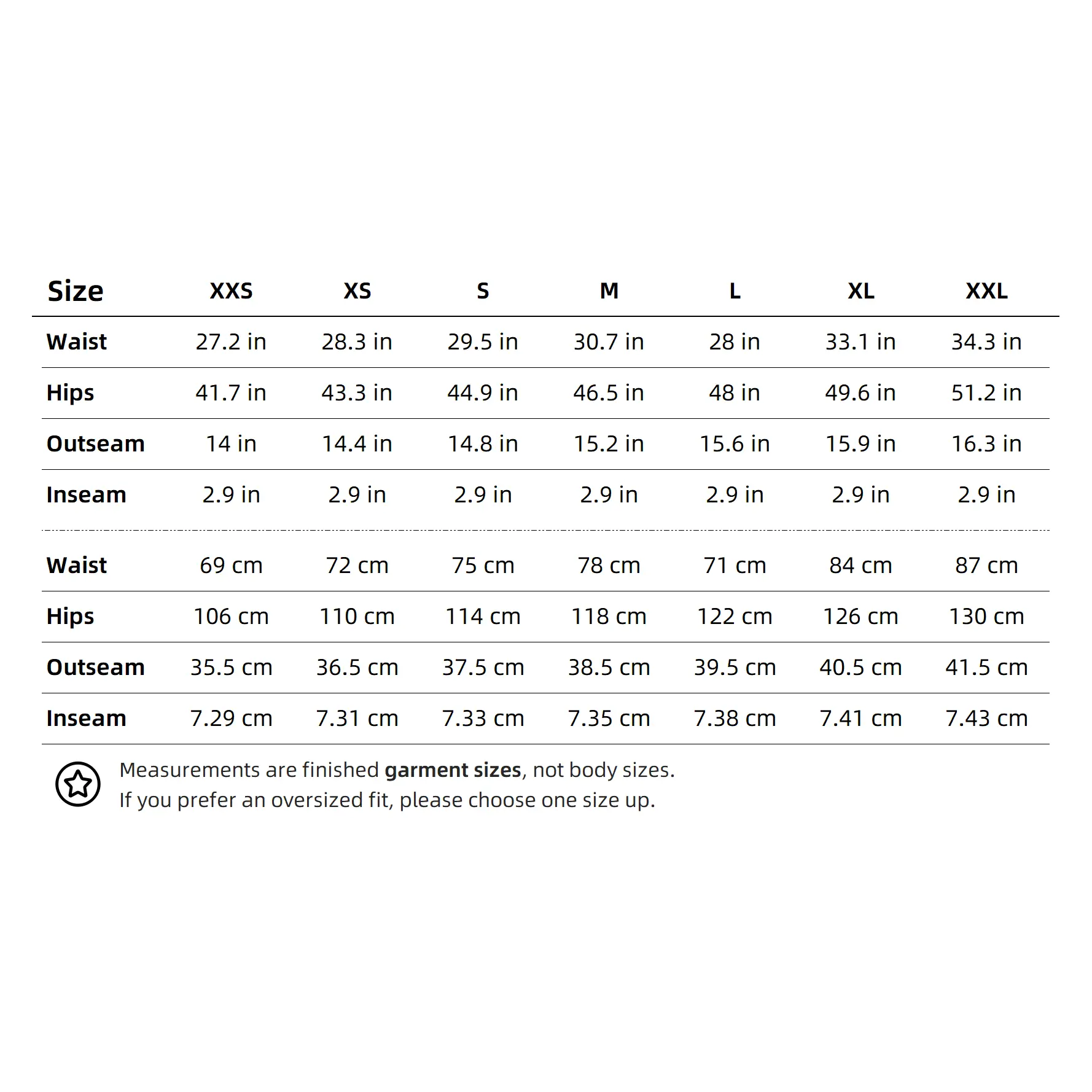 Size measurements are finished garment dimensions, not body measurements.