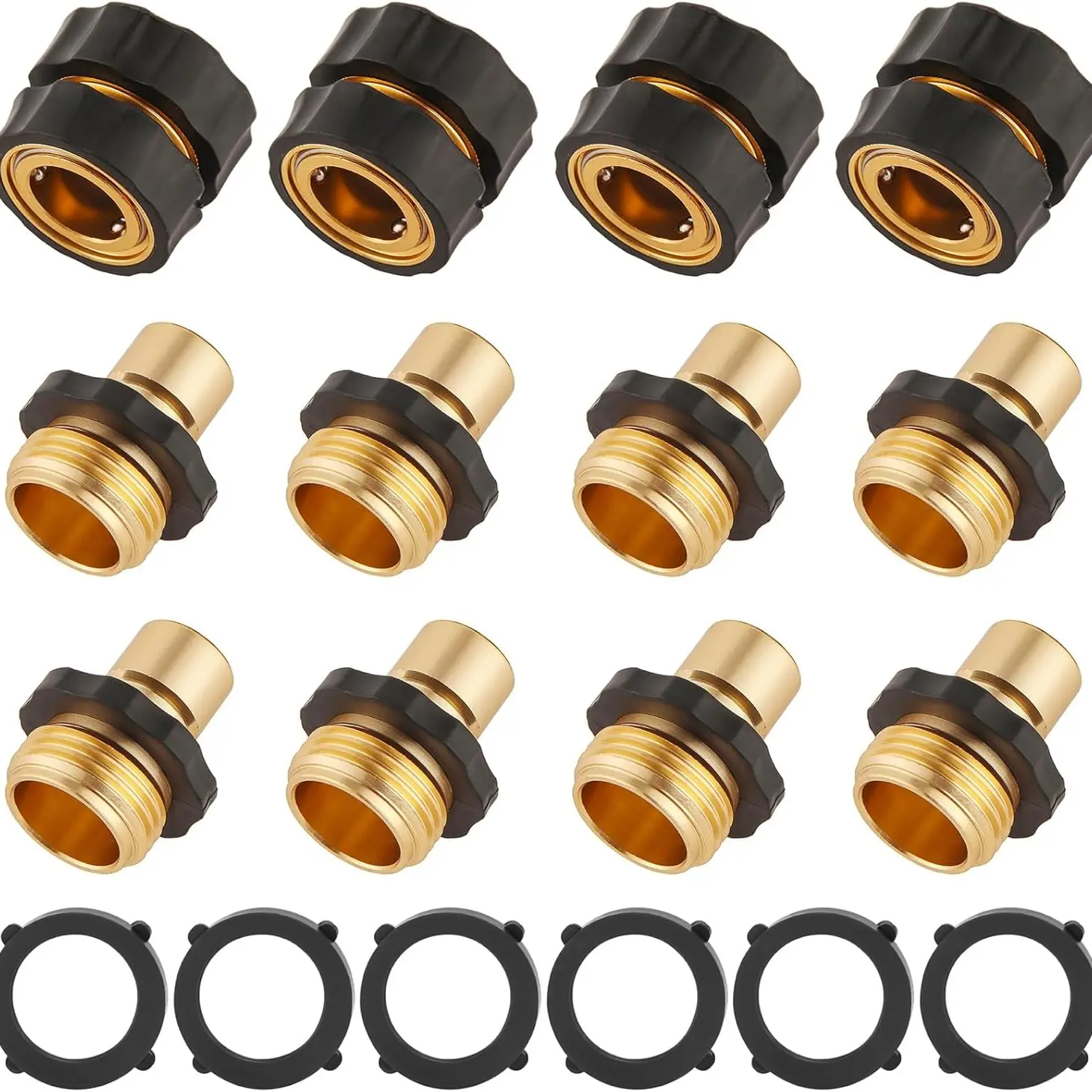 • 4/6 Set of quick connect hose fittings designed for garden hoses. Perfect for easy connections and quick releases. Each set includes a gasket for a secure fit. Ideal for 3/4 inch GHT male and female attachments.