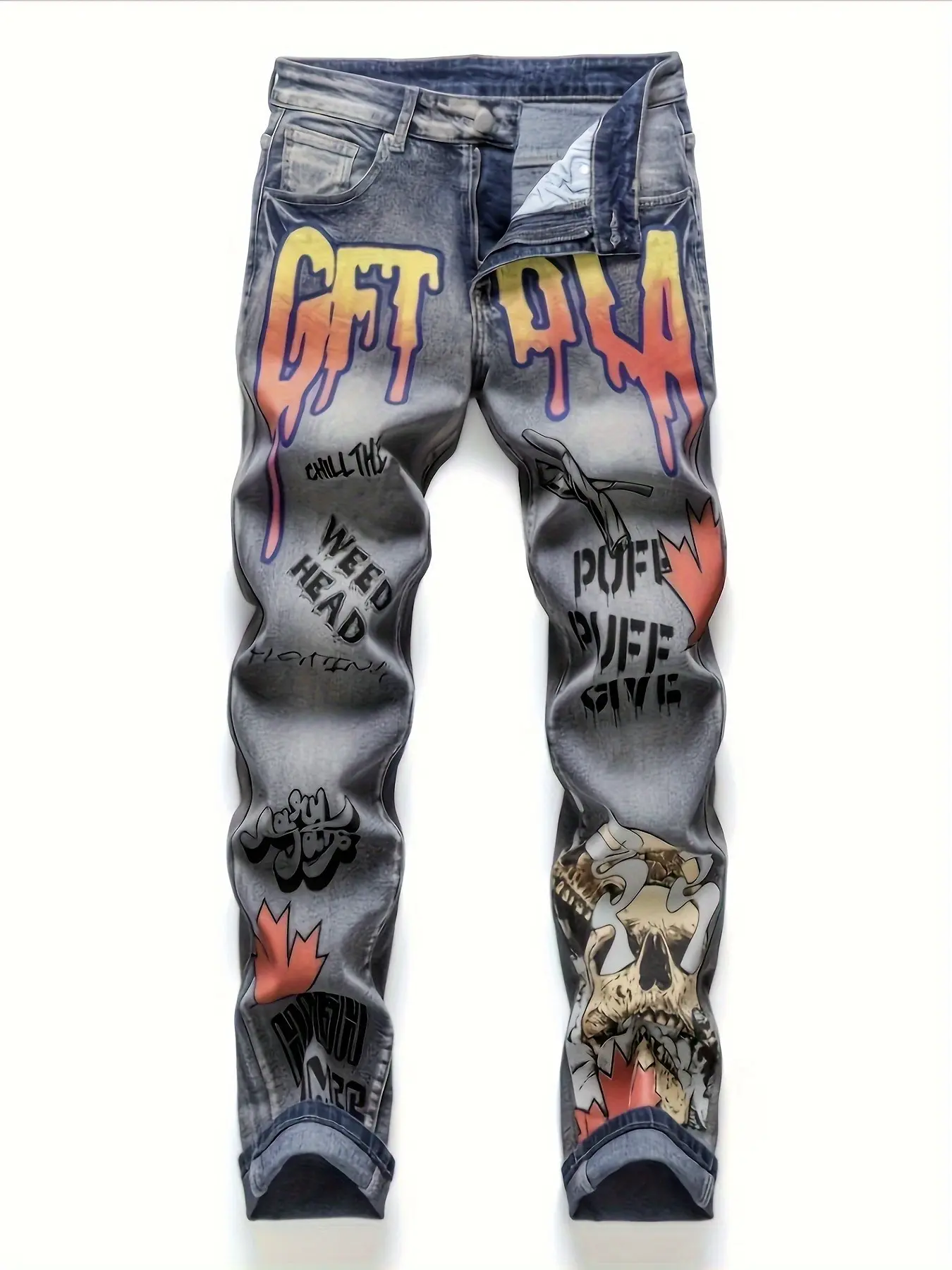 Western European and American Y2K trend, printed straight-leg jeans, vintage wash, versatile street style for men