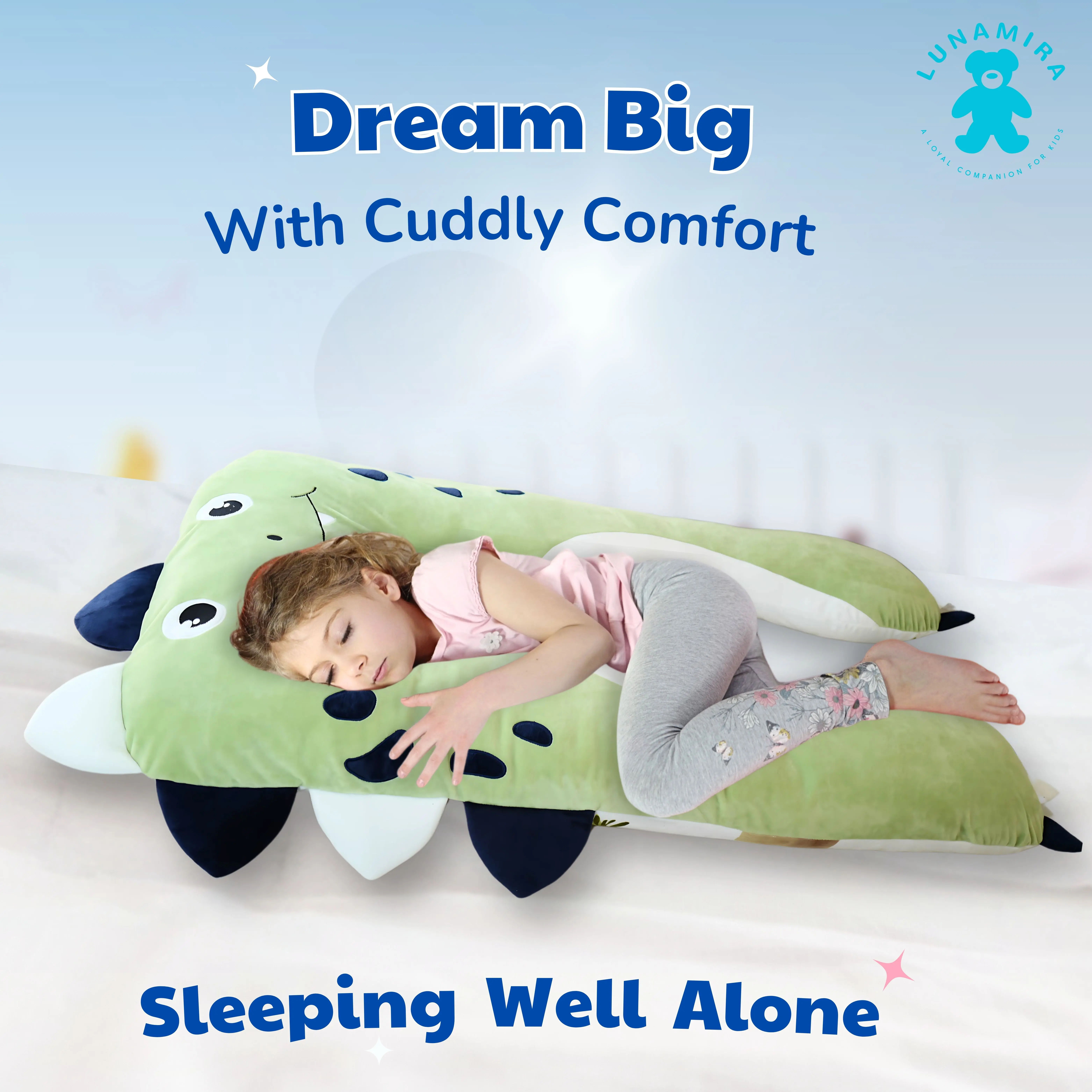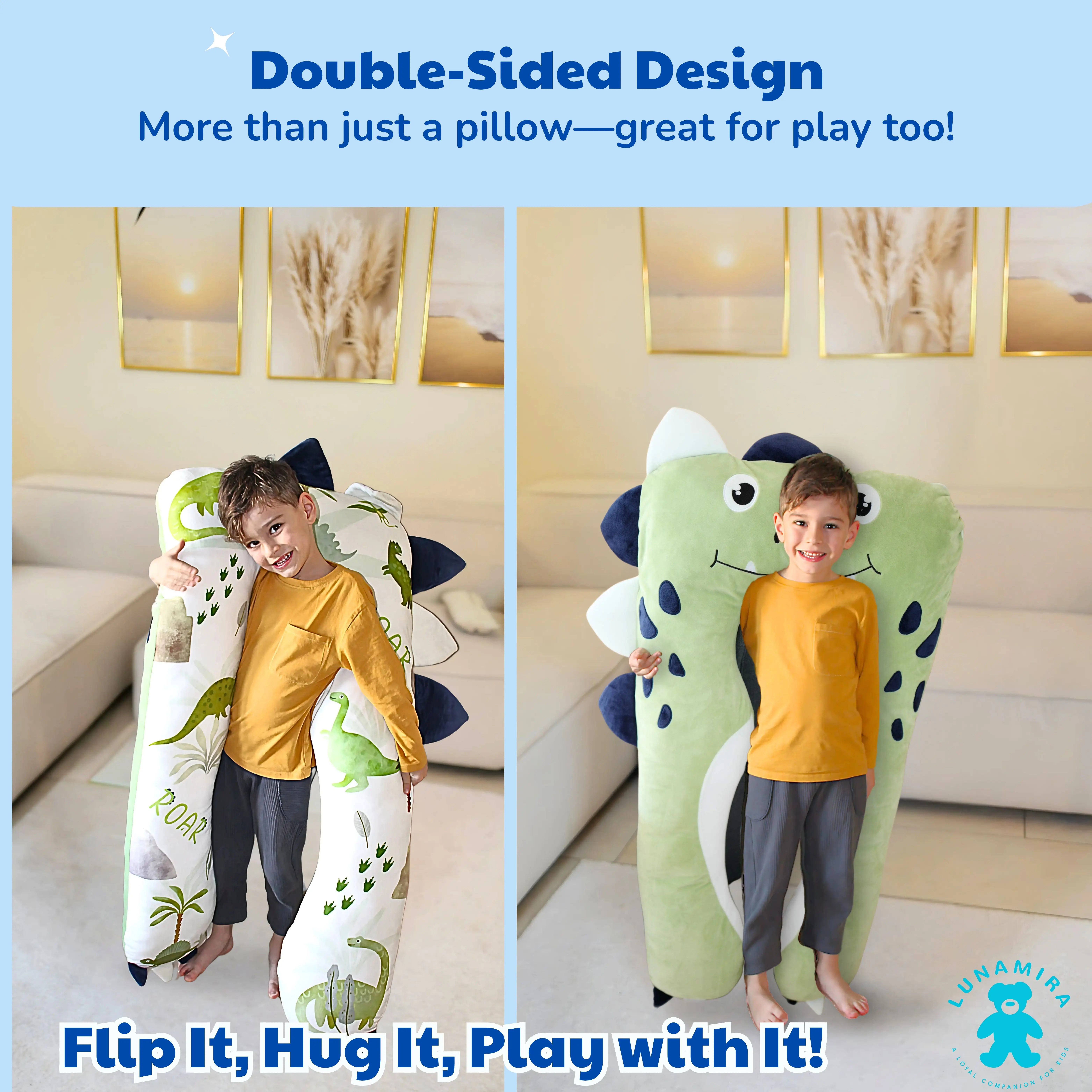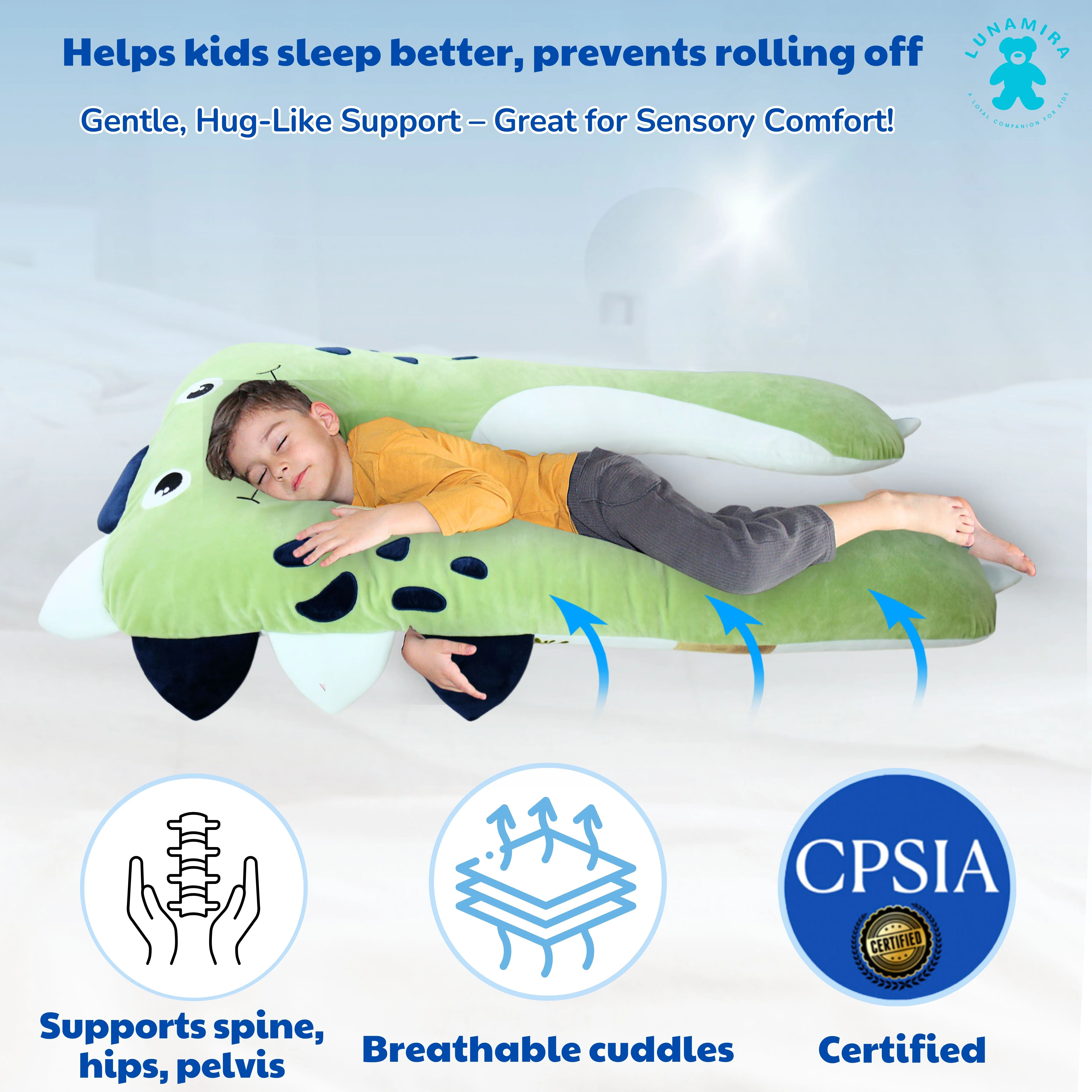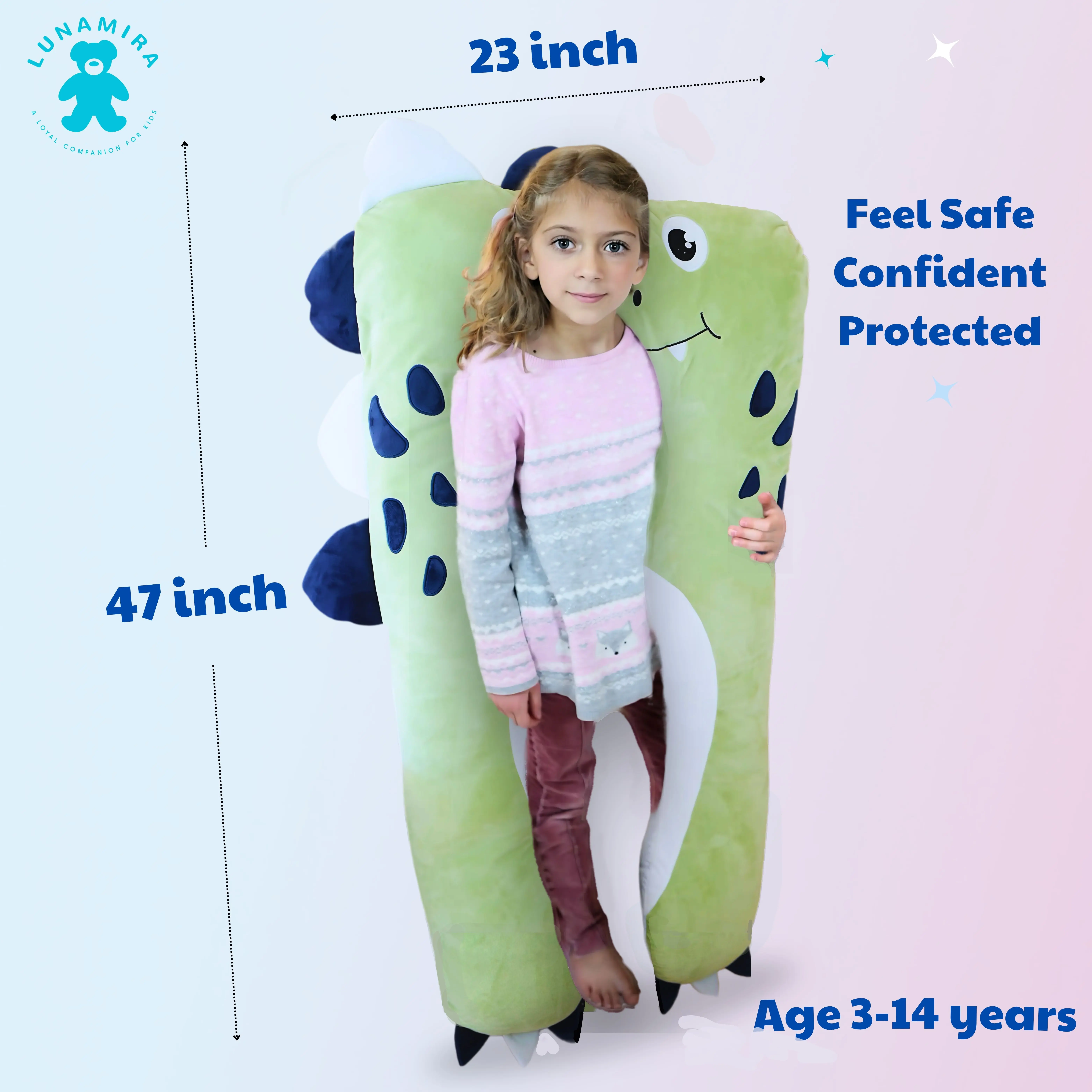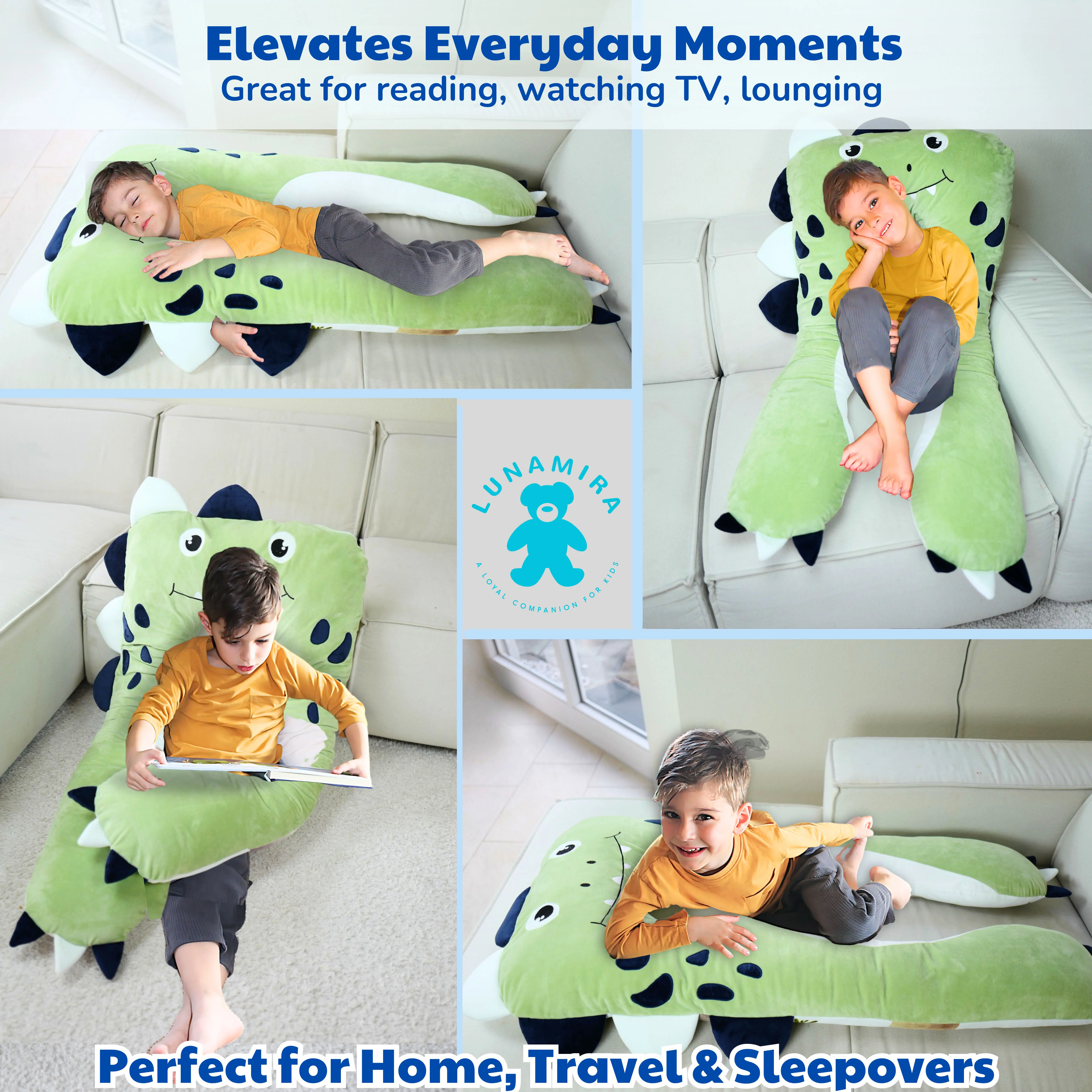 LUNAMIRA Dino Kids Body Pillow - 47" U-Shape Long Plush Soft Animal Pillow for Kids, Sleeping, Reading, ADHD & Special Needs Comfort, Anxiety, Washable Cover, Snuggle Fun Cuddle Gift for Boys & Girls