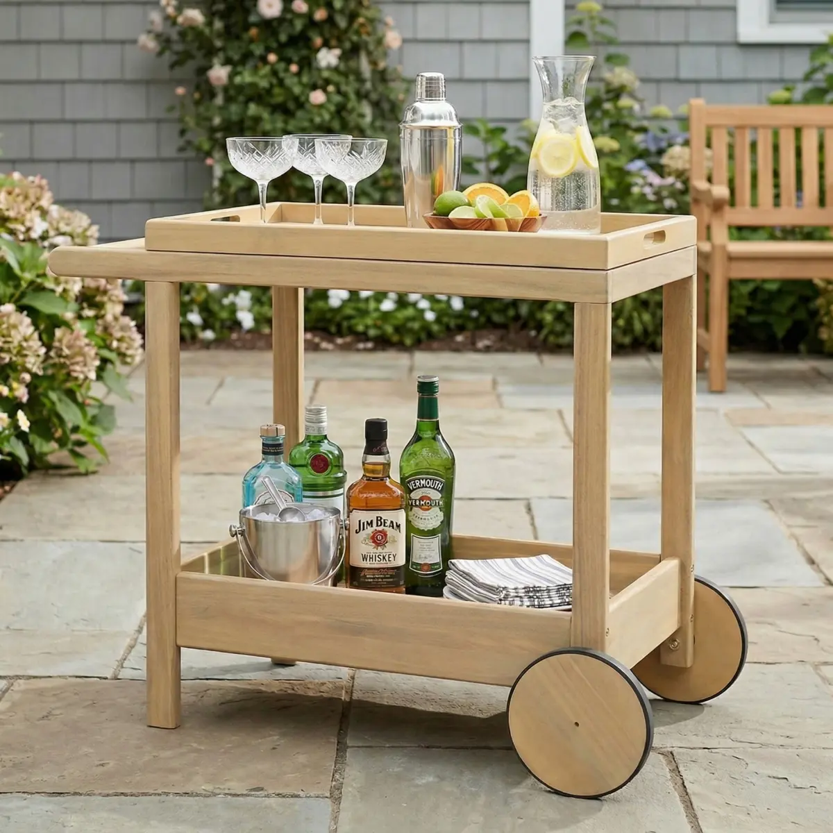 High - quality Material: This outdoor bar cart is made of acacia wood.Acacia wood is hard with beautiful grain, and has excellent weather resistance and corrosion resistance.It can easily cope with various complex outdoor weather conditions, is not prone to damage, and has a long service life.