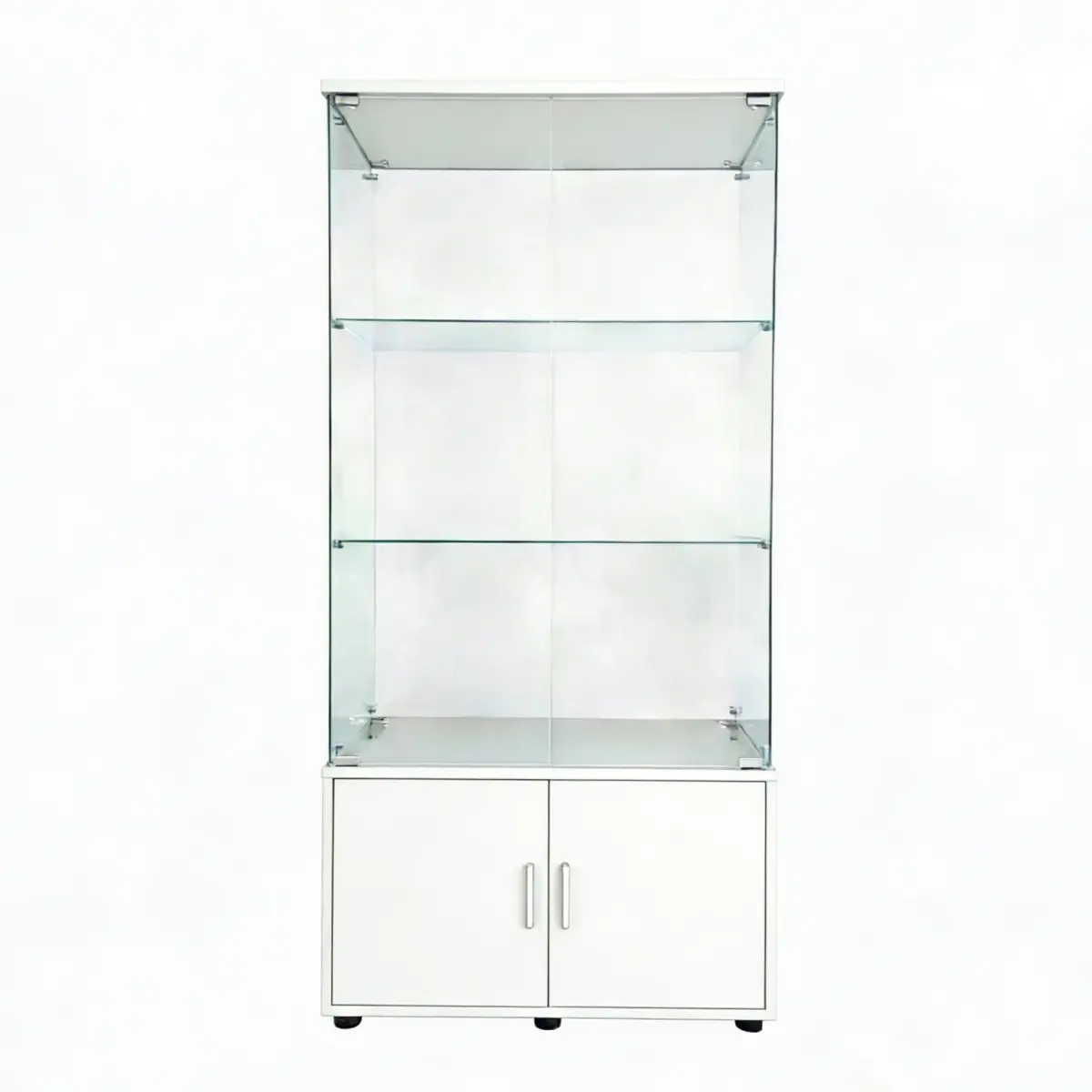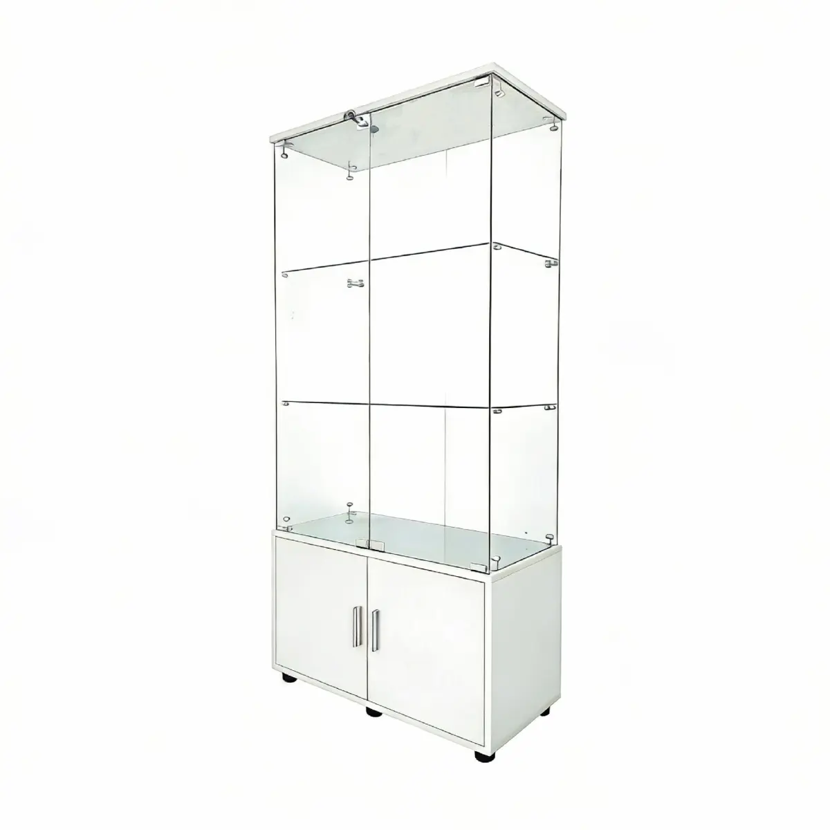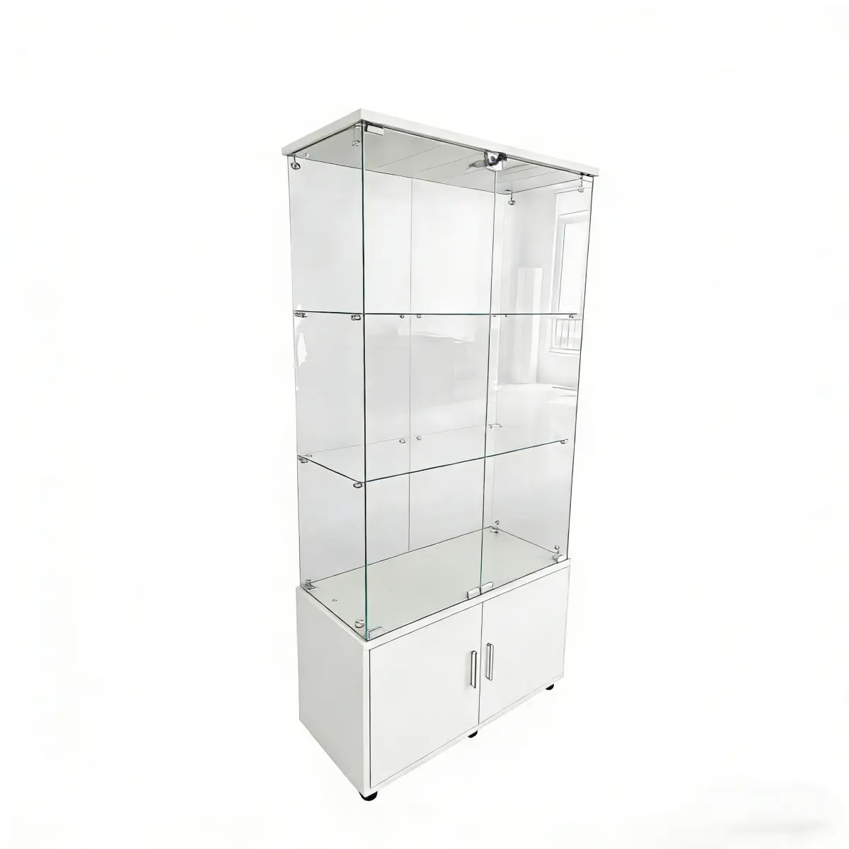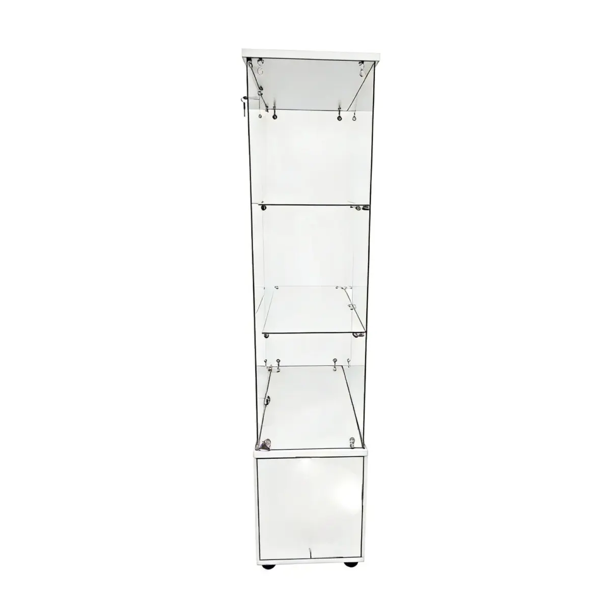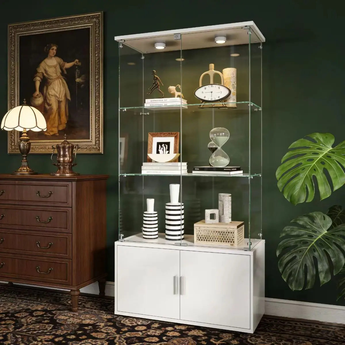 Tempered Glass Display Cabinet: Measures64.57" (H) x31.69" (L) x14.17" (W), with an overall weight capacity of 110 lbs, each tempered glass shelf can hold up to 11lbs, Color: white