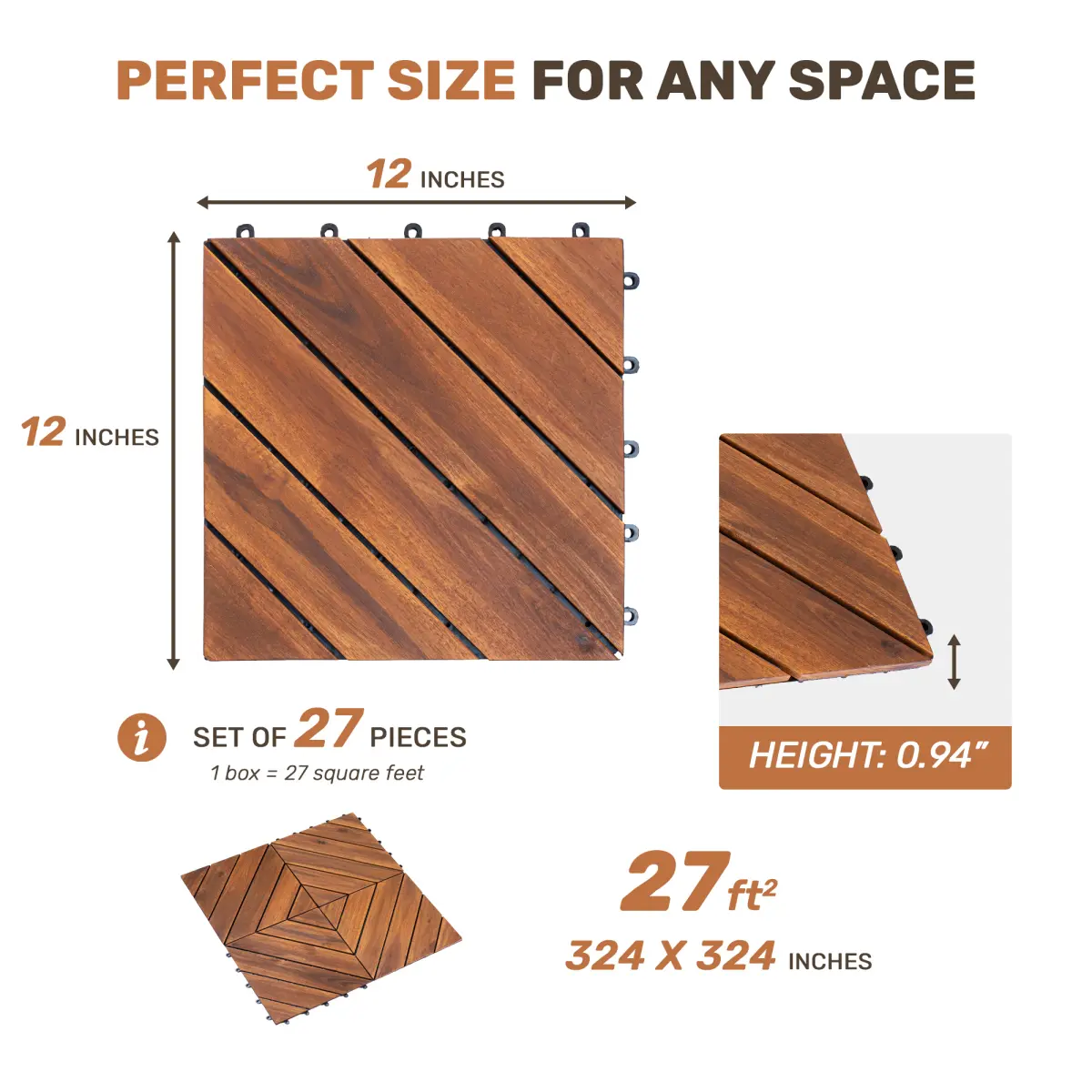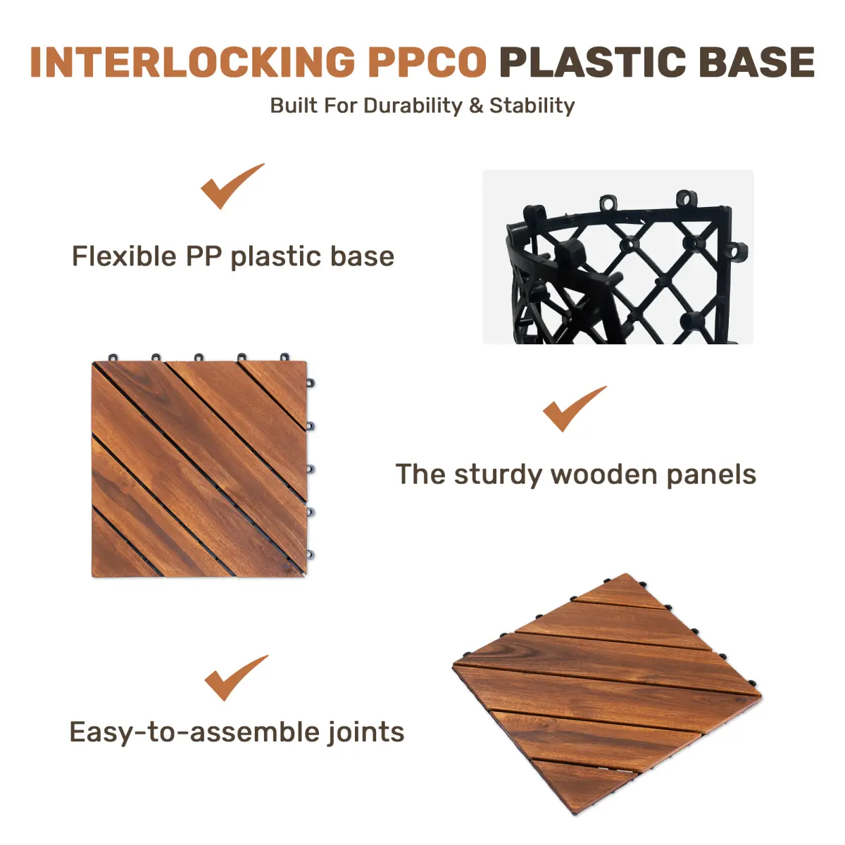 ·Stable Tile Design: Each wooden tile measures 12 x 12 inches.With a total height of 0.8 inches, the wood layer is 0.47 inches thick and mounted on a stable plastic base.The interlocking deck tile structure ensures strong support, while the open design enables efficient drainage, making these patio floor tiles outdoor waterproof and preventing water buildup.
