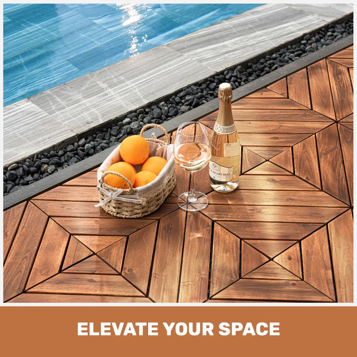·Weatherproof Surface: The surface of the acacia wood tiles is finely sanded with 240-grit sandpaper and treated with water-based oil.This creates decking tiles outdoor waterproof that are highly resistant to moisture, rain, and mold, perfect for balcony tiles outdoor waterproof or porch flooring outdoor waterproof.