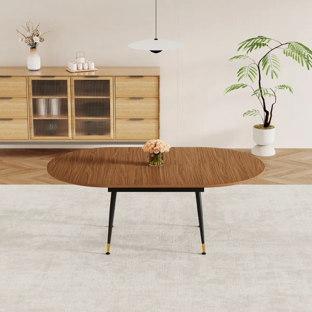 ·Elevate your dining space with our Walnut Oval Extendable Dining Table, a perfect blend of modern design and practical functionality.Crafted from high-quality MDF, this table features a rich walnut finish that adds warmth and elegance to any home decor.
