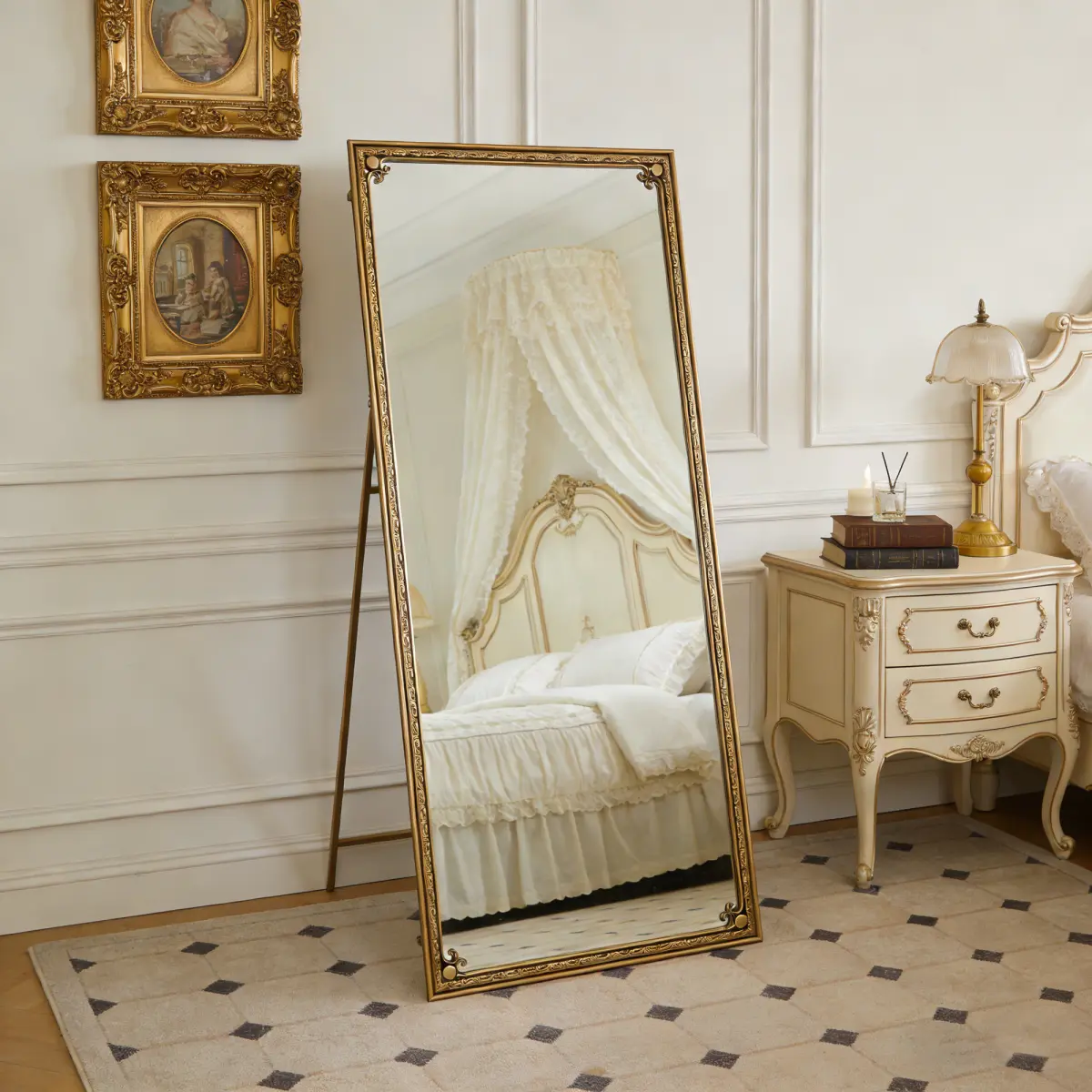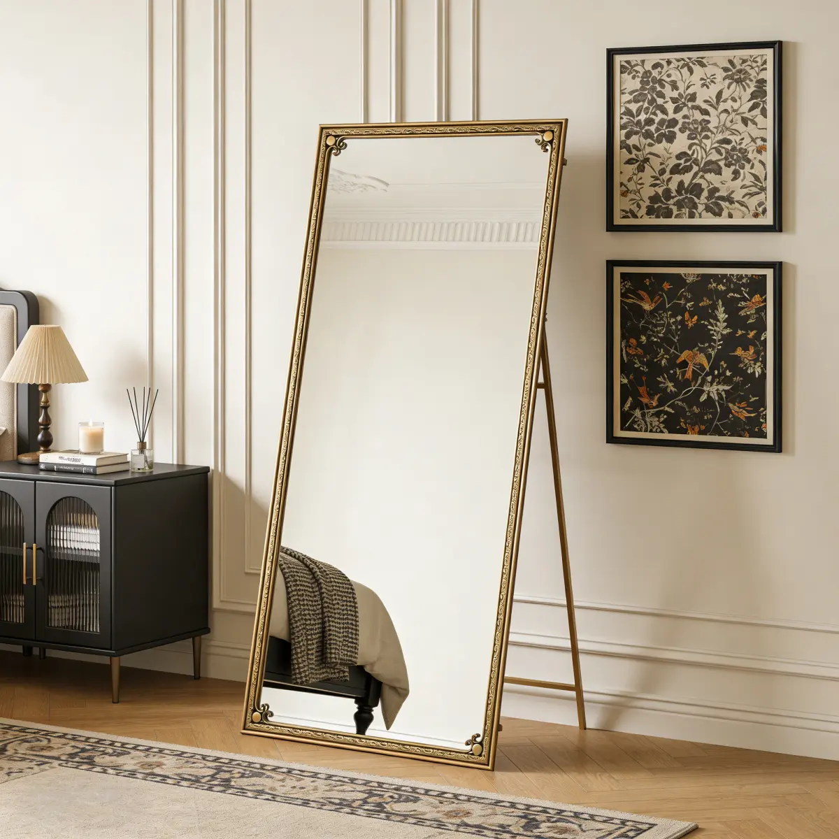 ·Full Length Mirror - This decorative floor dressing mirror features large rectangular shape, solid beaded design and antique dark gold finish of frame, which completes a classic-style decor.The composite frame construction ensures durability and stability.Besides, a sleek silhouette features an arch edge, adding to an artistic effect.