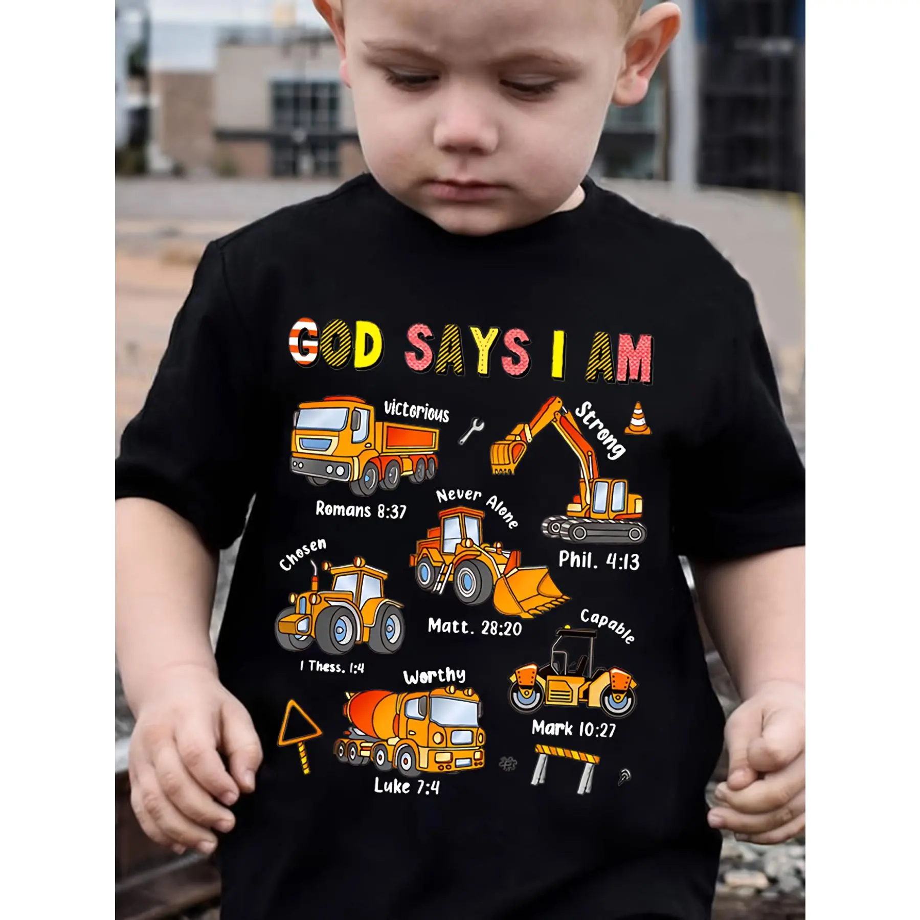 Faithbased Boys' Christian Construction Vehicle T-Shirt | Bible Verse Tee with Excavator, Truck, Builder Words - Construction Site Birthday Outfit - Religious Kids Clothing