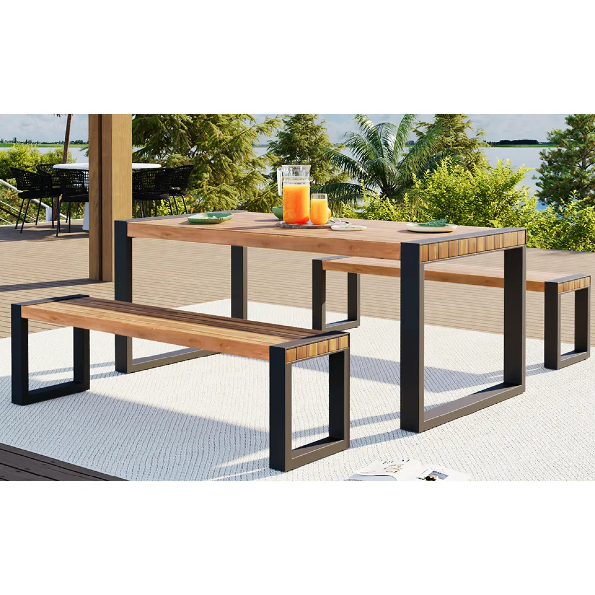 Including one dining table and two benches, this set has everything you need for indoor and outdoor dining.Made with solid acacia wood and industrial powder-coated steel legs, the dining bench set brings a modern touch to a time-tested design.Due to the natural variations in acacia wood, each piece is unique.Assembly is required, approximately taking 15 minutes, and maintenance involves wiping clean with a damp cloth.It's advised to avoid sharp temperature changes, and indoor storage is recommended for areas with rainy or cold climates.