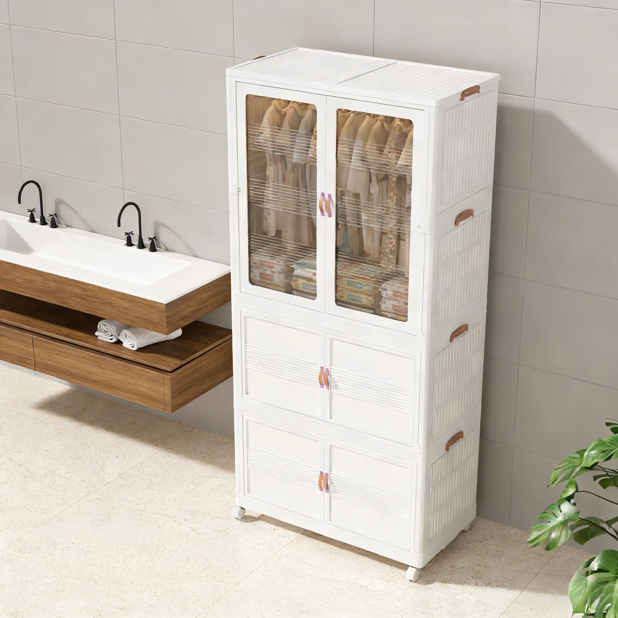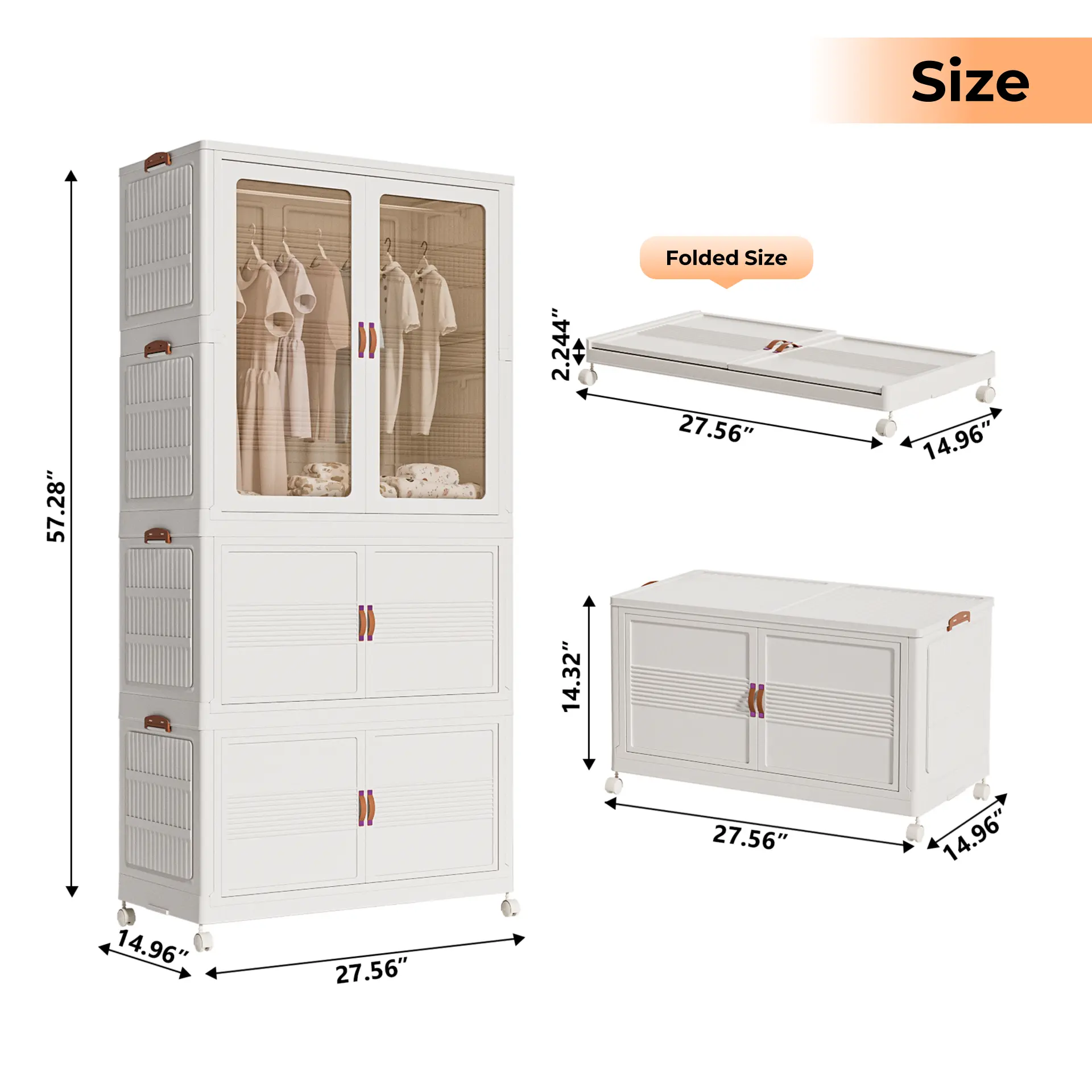 Aesthetic Foldable Storage Cabinet with Wheels – Stackable Organizer Bins with Magnetic Doors for Bedroom, Closet & Dorm