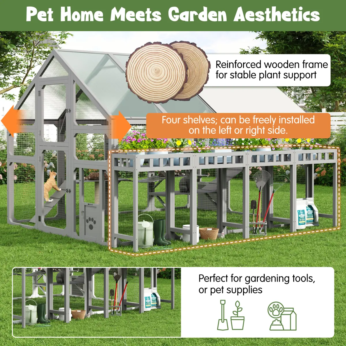 ·Built-In Planter & Storage Stand: Features a versatile side stand where the top can hold flower pots and the bottom provides space for storing tools or accessories.Designed for flexible placement, it can be positioned on either side to suit your patio or backyard layout, combining style and practicality for both your garden and your cat’s outdoor space.