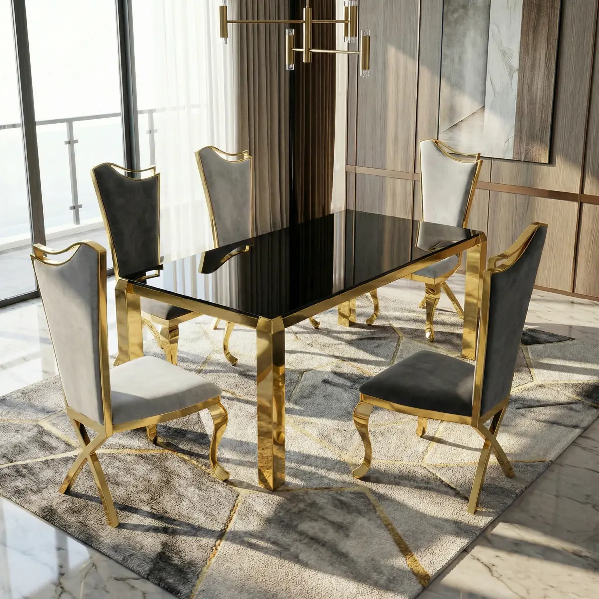 ·201# stainless steel with PVD gold plating, paired with 10mm black tempered glass, creates a high-end, modern aesthetic for your dining space