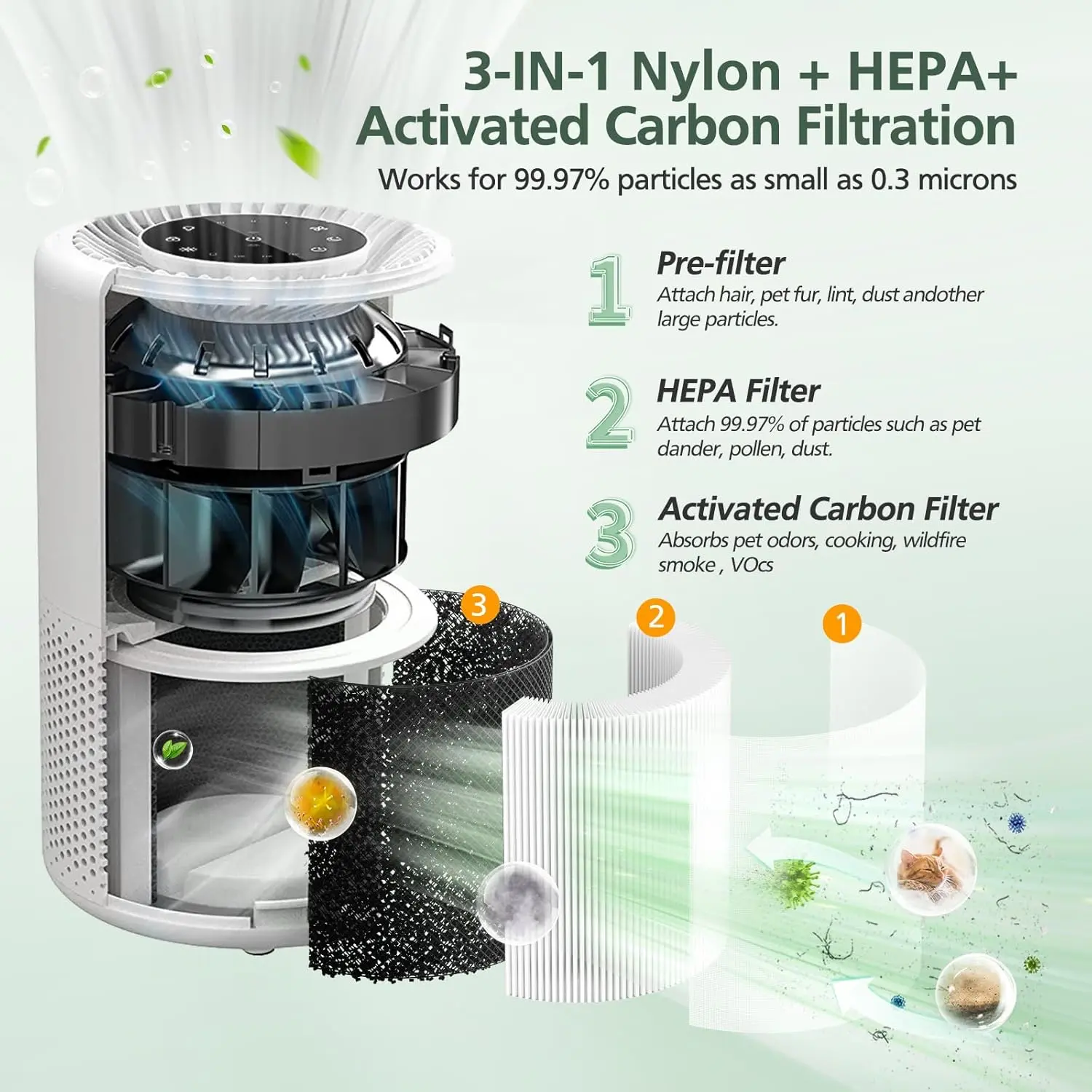 ·3-in-1 Filtration System – Pre-Filter, Main Filter, and Activated Carbon Filter work together to remove dust, odors, and smoke particles.