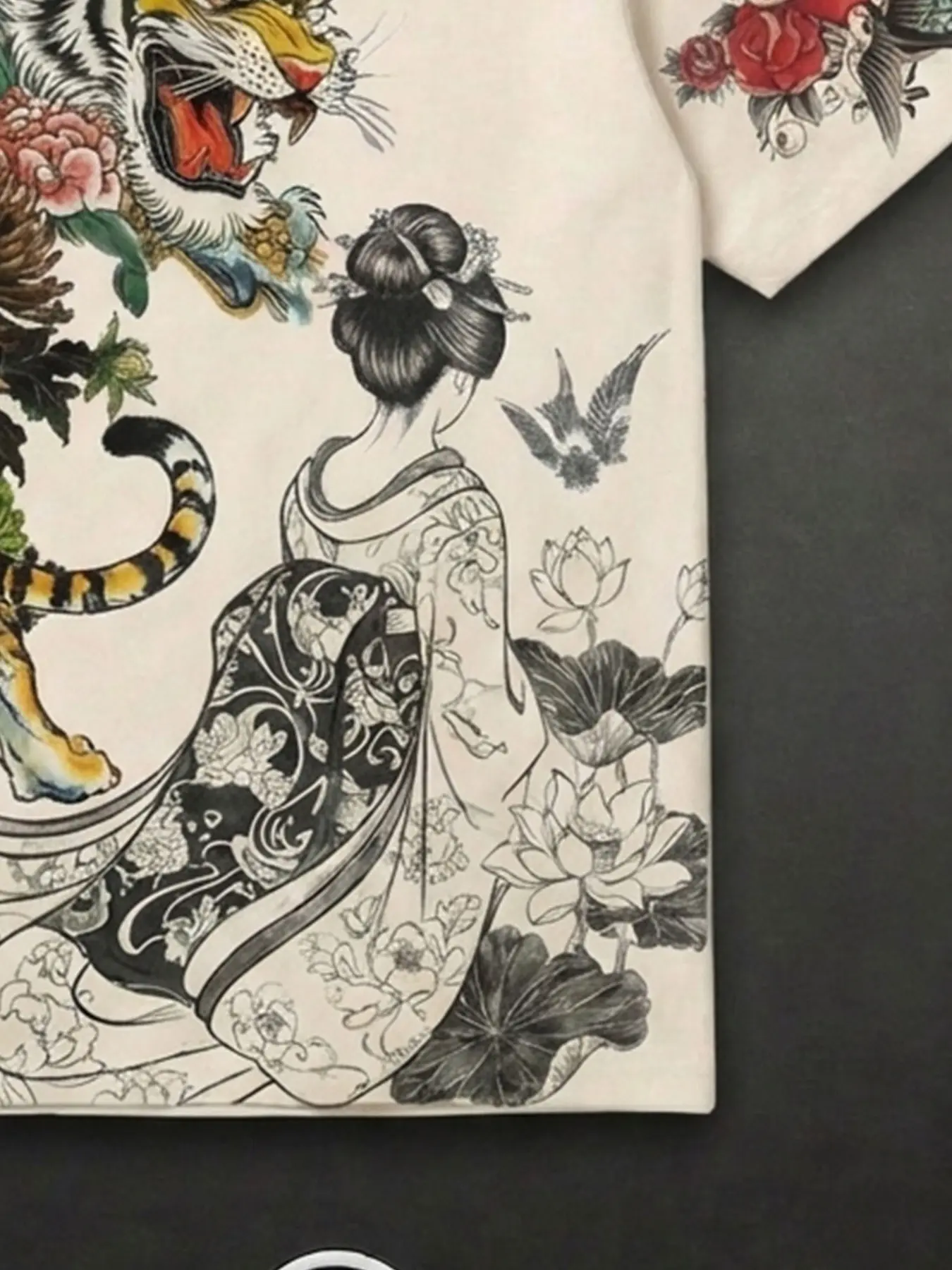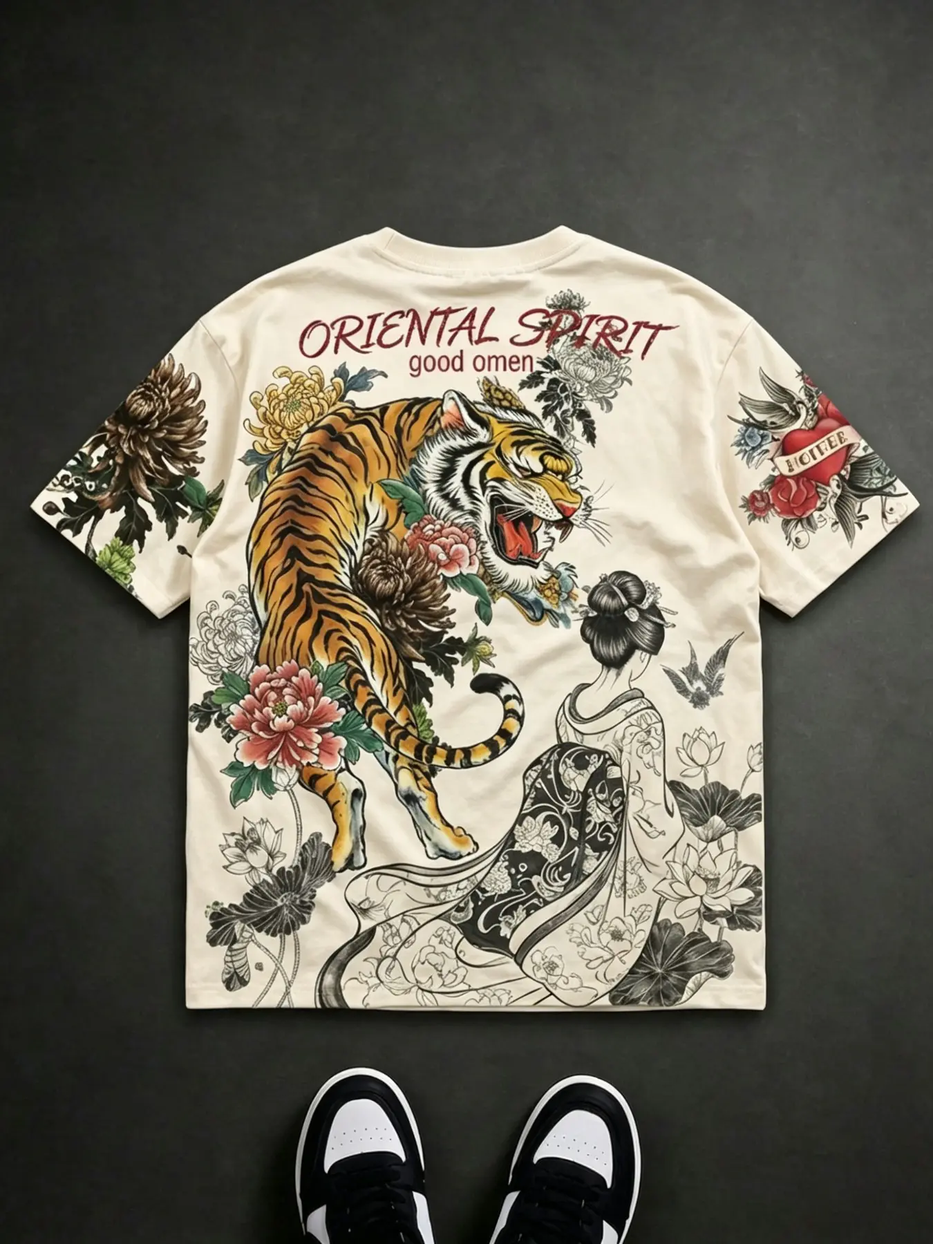 Viral Japanese tattoo style tiger pattern T-shirt, Oriental Spirit Y2K streetwear, retro aesthetic T-shirt with geisha and floral prints, perfect for streetwear and casual wear # streetwear # patterned T-shirt # Japanese tattoo # Oriental Spirit