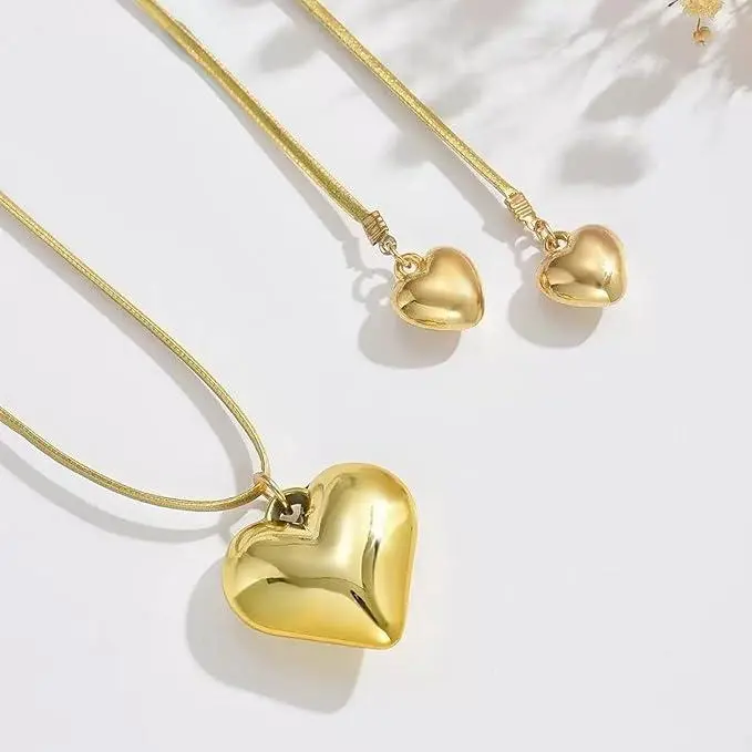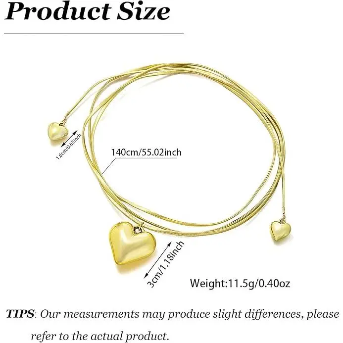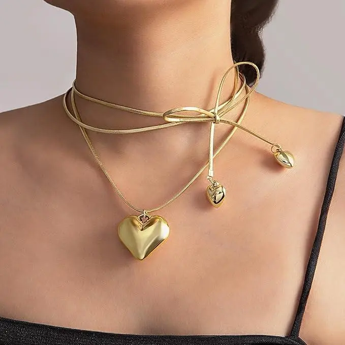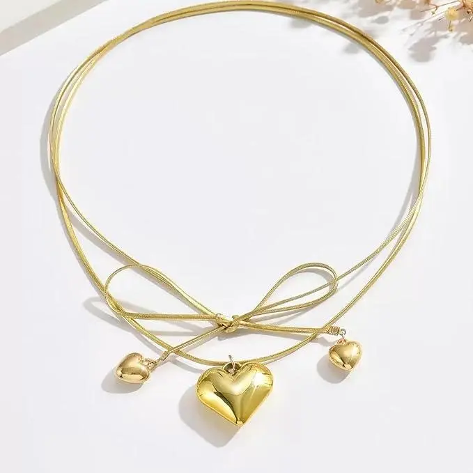 Layered Design: This gold heart necklace set features a captivating 3 - layer design. The combination of different chain styles, including a thick rope - like chain and delicate thin chains, creates a visually appealing look. At the center, a large, shiny heart - shaped pendant steals the show, flanked by smaller heart - shaped charms, adding a sweet and romantic touch to any outfit.
