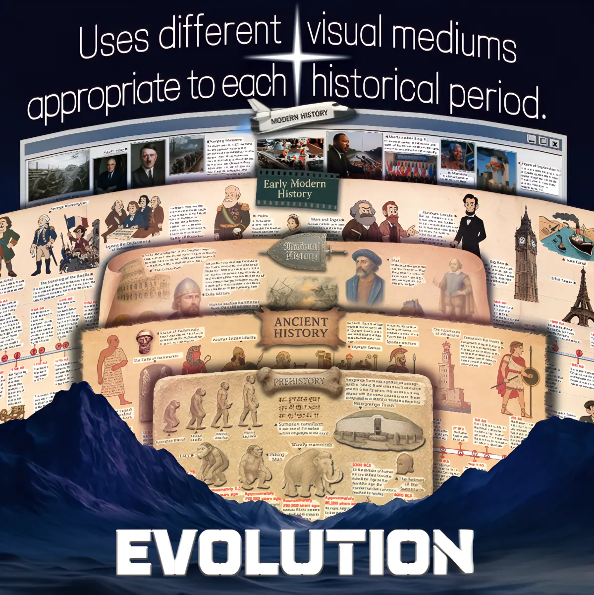Featuring rich illustrations and era-matched visual styles, the scroll presents history in a more vivid way. Different periods are shown with distinct visual treatment, helping readers quickly recognize shifts in time while making the learning experience more immersive and enjoyable.