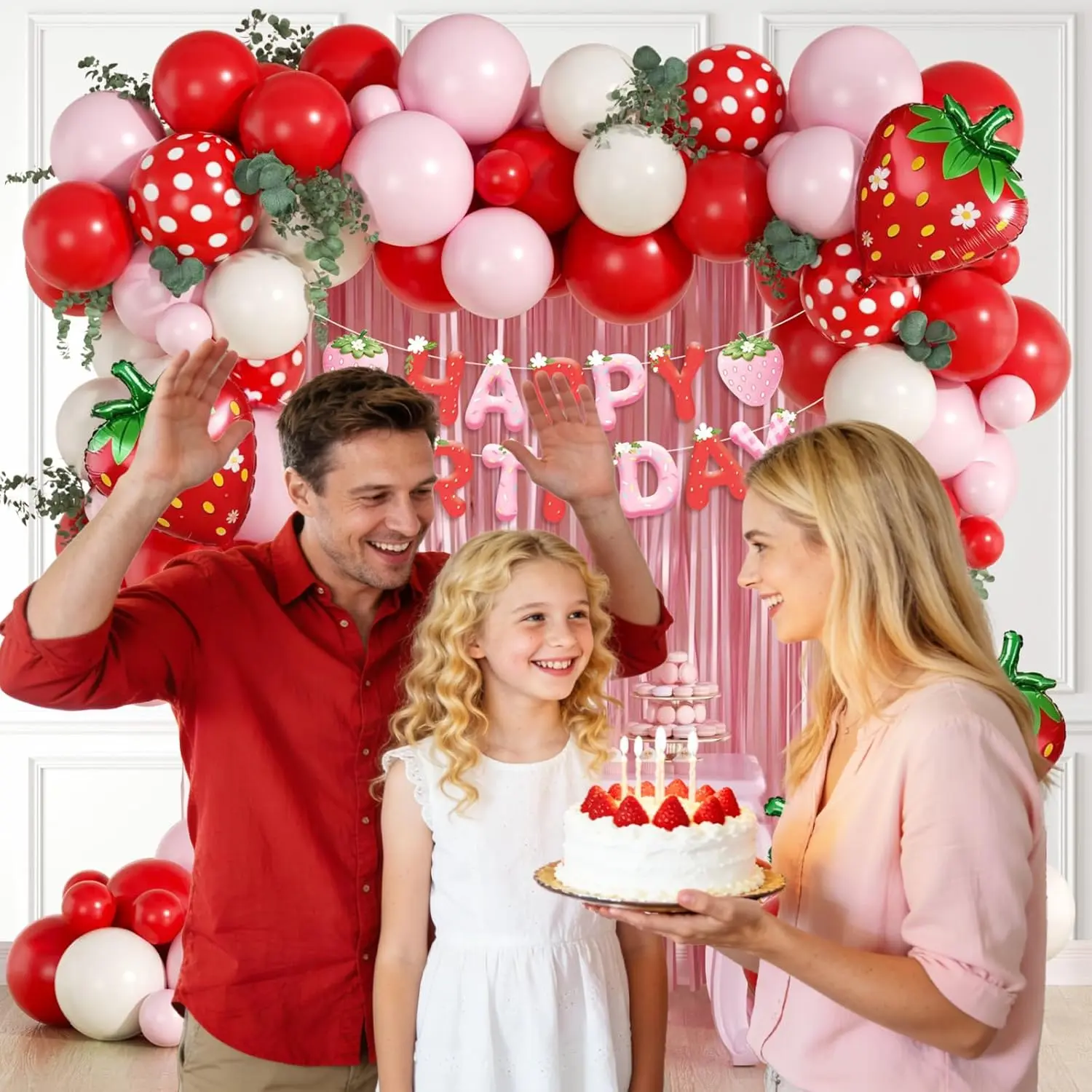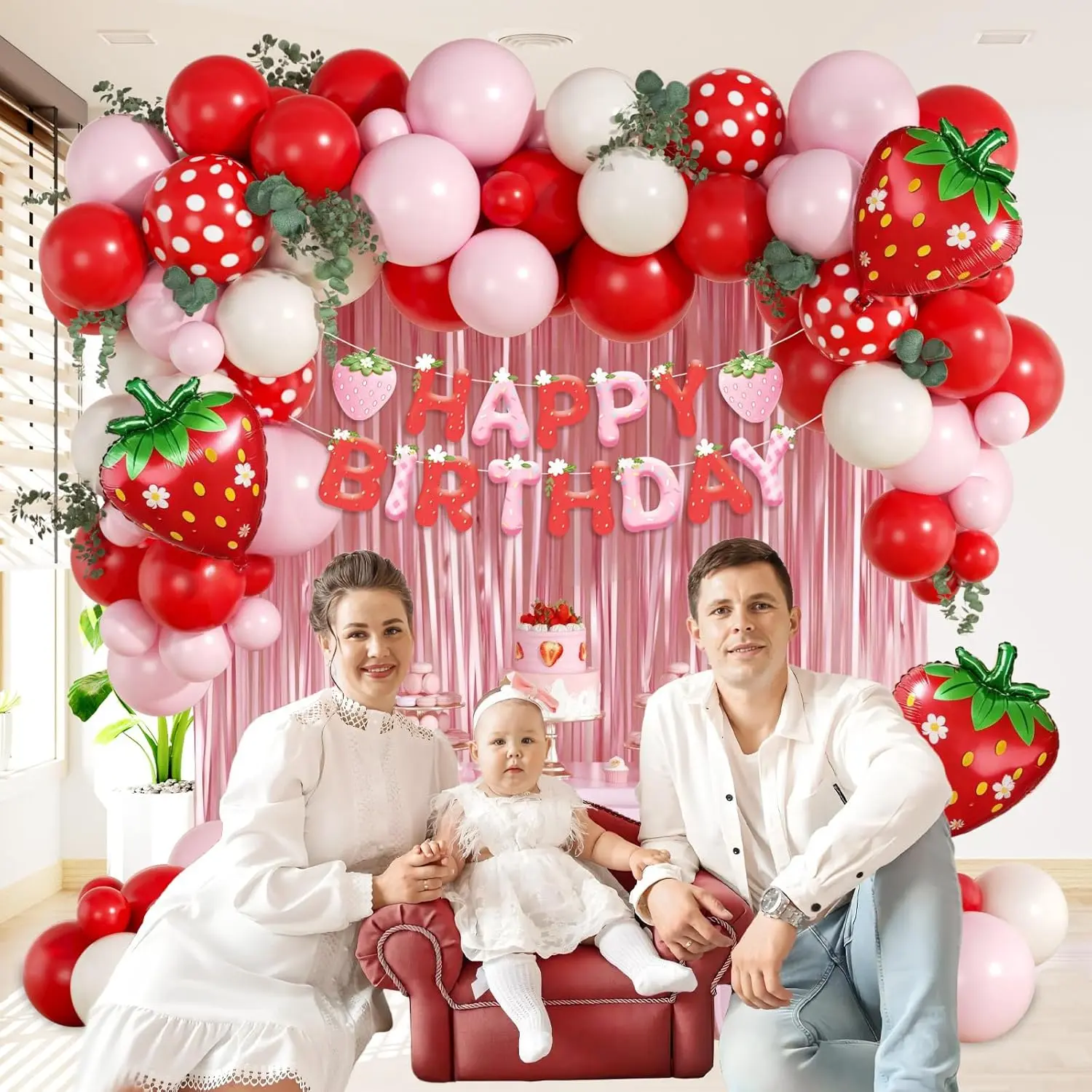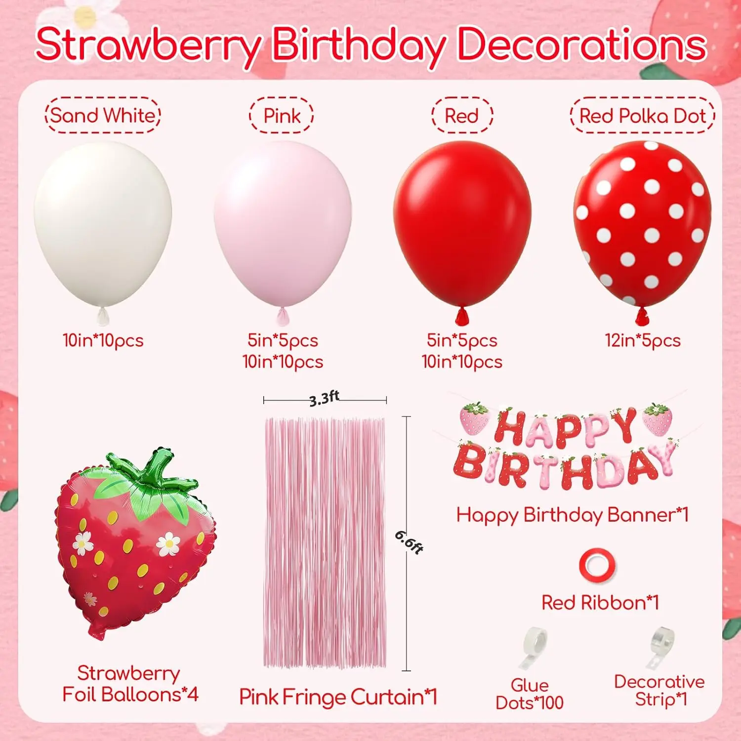 Strawberry Birthday Party Decorations Set with Pink Fringe Curtain, Happy Birthday Banner & Pink Red Sand White Balloons, Ideal for Strawberry Themed 1st Birthday & Baby Shower