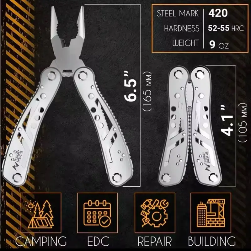 Be ready for anything with this compact all-in-one multitool. Includes pliers, wire cutter/stripper, blades, saw, screwdrivers, can/bottle opener, file, ruler, scraper, awl, and 11 magnetic bits. Made from durable 420 stainless steel for strength and corrosion resistance. Perfect for camping, DIY, car repairs, and emergencies. Comes with a heavy-duty sheath for easy carry.