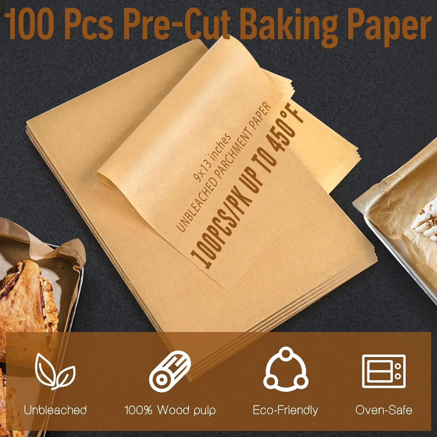• 100 Pcs Parchment Paper Baking Sheets – Ideal for various cooking methods. These non-stick sheets are precut to 9x13 inches, making them perfect for baking, grilling, air frying, steaming, and more. Unbleached, they are safe for all your culinary creations.