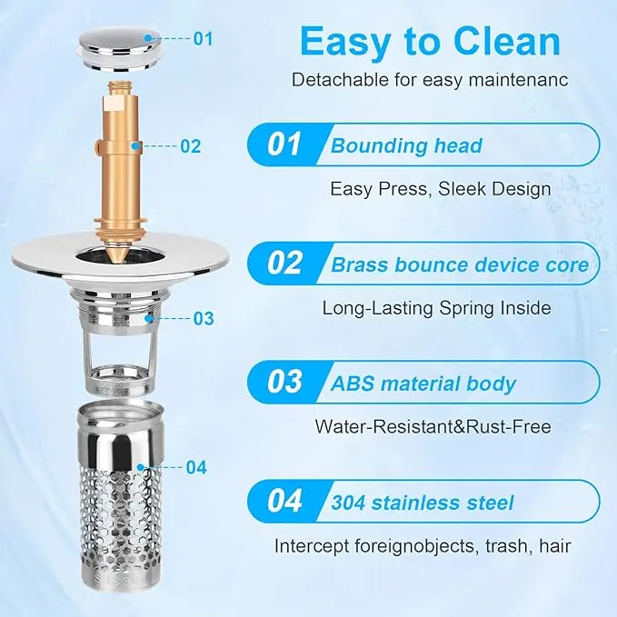 Upgrade Stainless Steel Modern Anti-Odor Bathroom Sink Stopper with Bouncing Core & Brass Pop-Up Drain Plug for Bathtub Home Goods ,universal bathtub drain stopper,bathroom sink strainer High Pressure Shower Handheld Shower Head