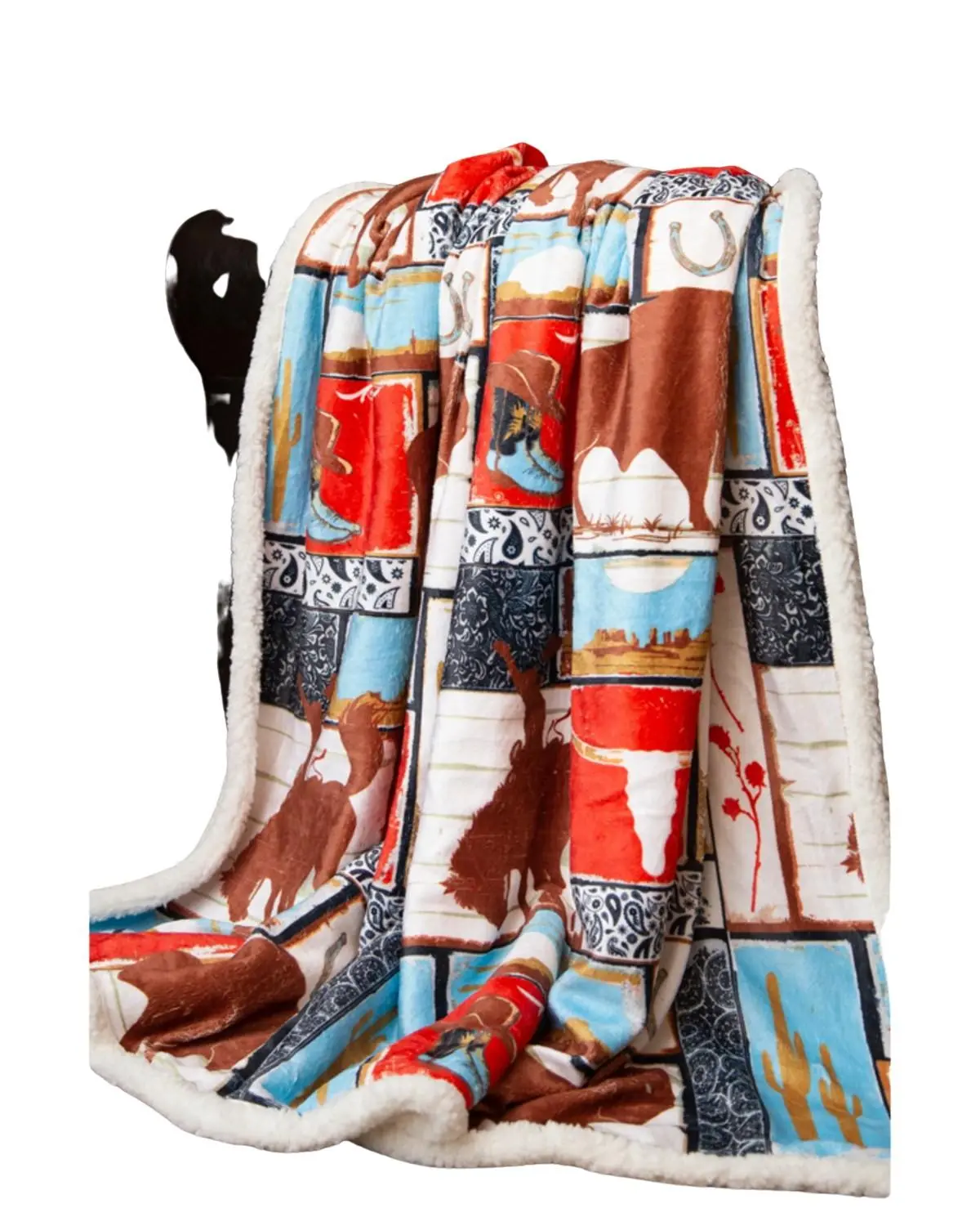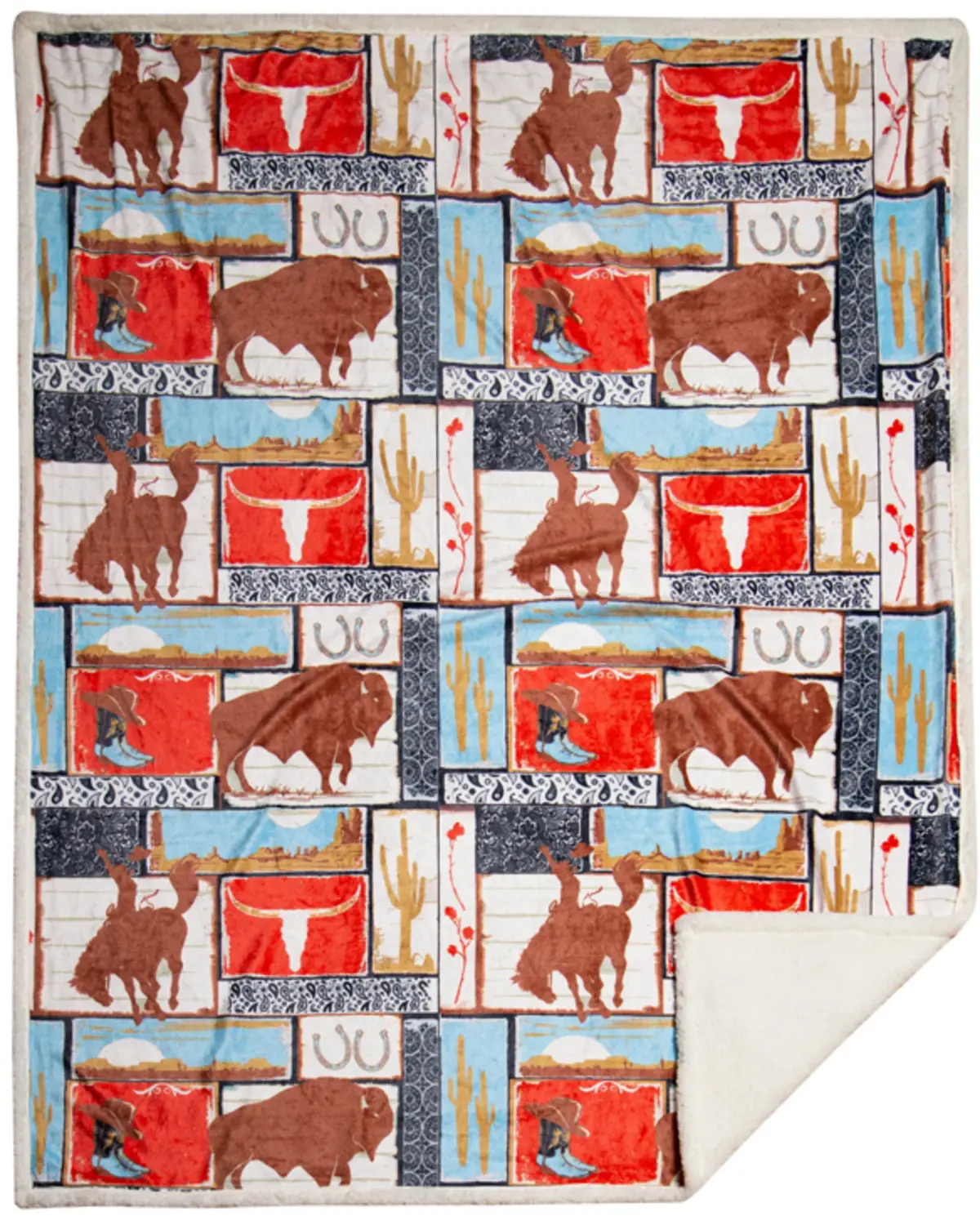 Dimensions: 54" x 68". Sherpa material. Machine wash warm, tumble dry low. Allover varied western patchwork design. Machine wash cold, tumble dry low. Imported.