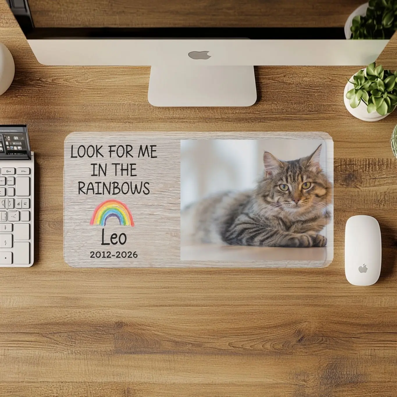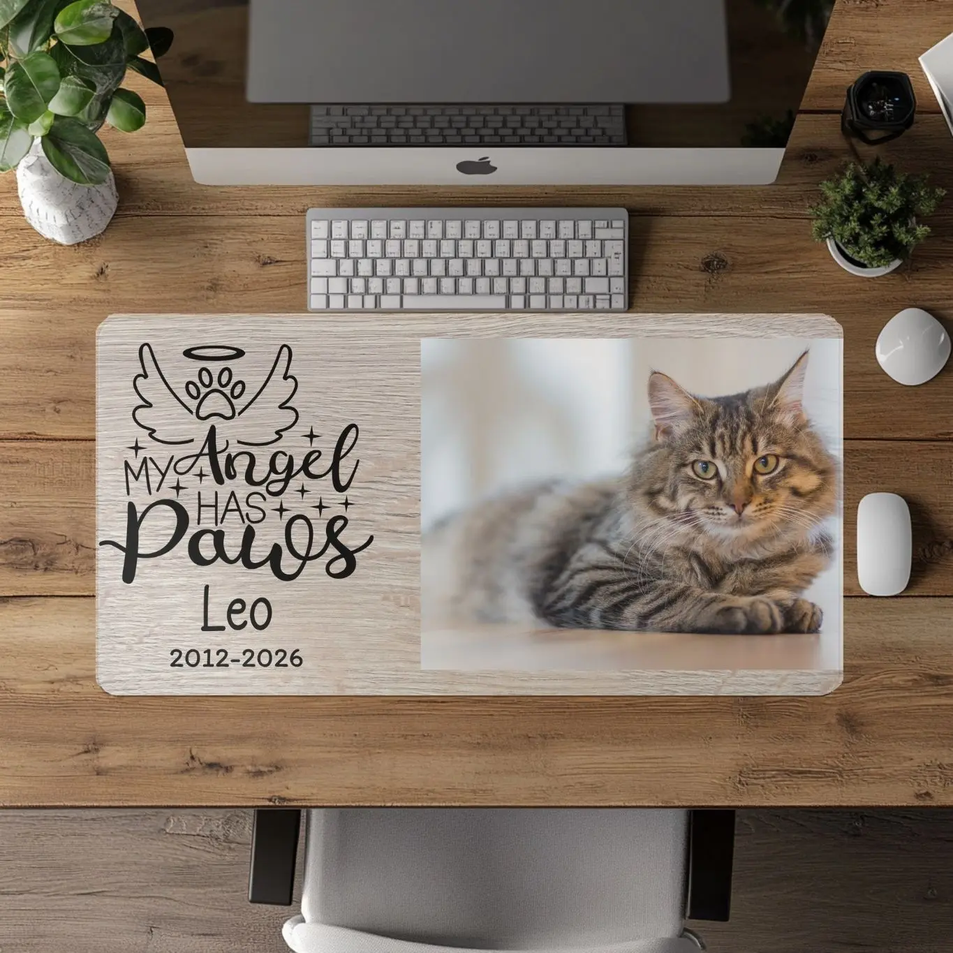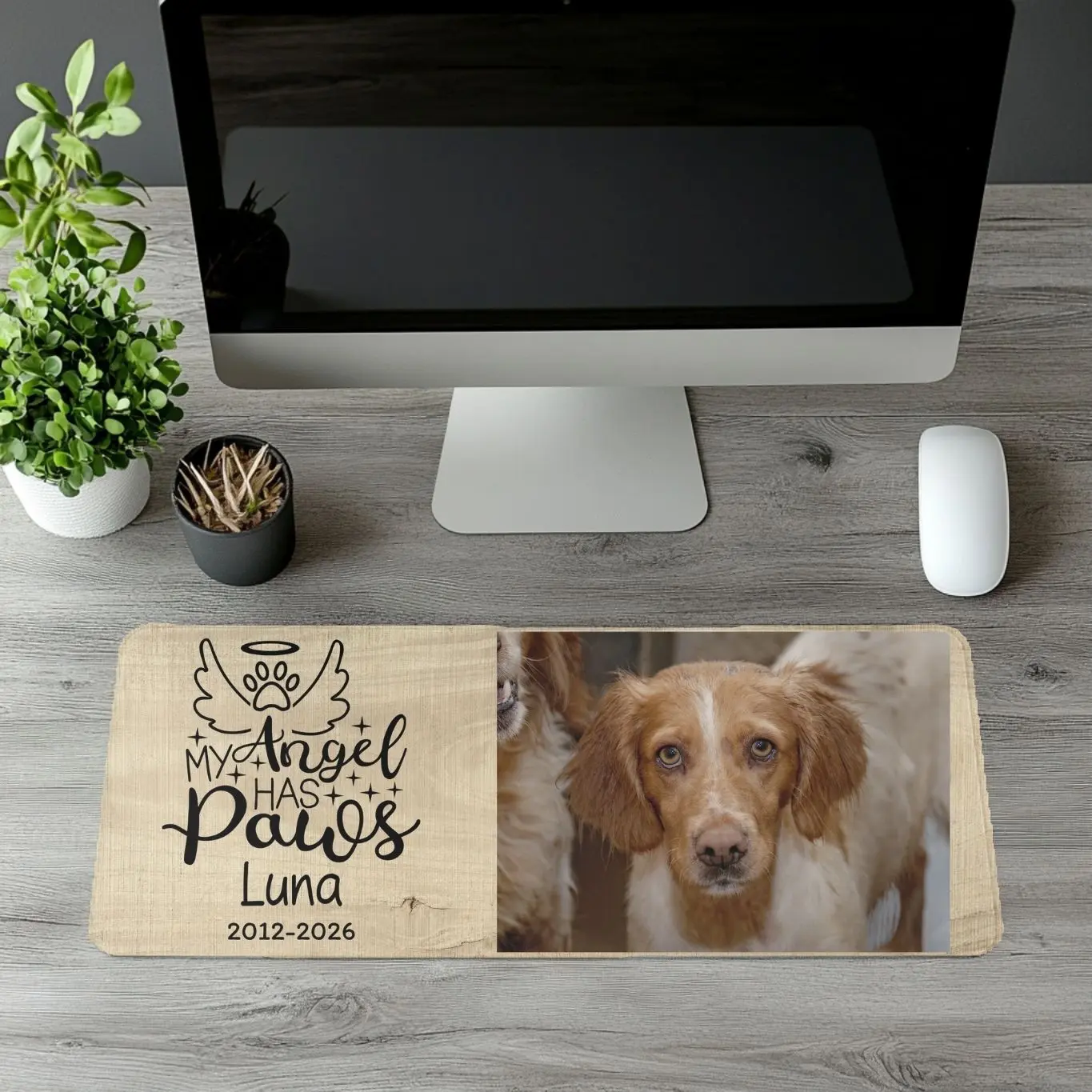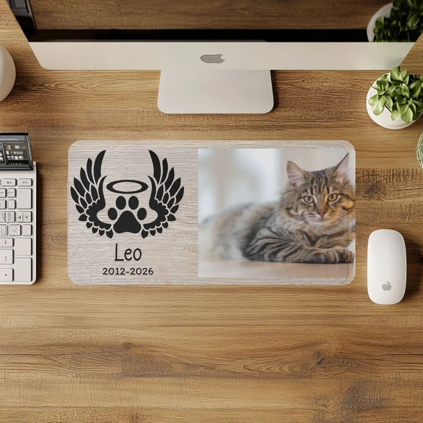 Honor the memory of your beloved companion with our Personalized Pet Memorial Desk Mat. This custom pet loss memorial mouse pad features your pet’s portrait, name, and meaningful dates, creating a beautiful and lasting tribute.