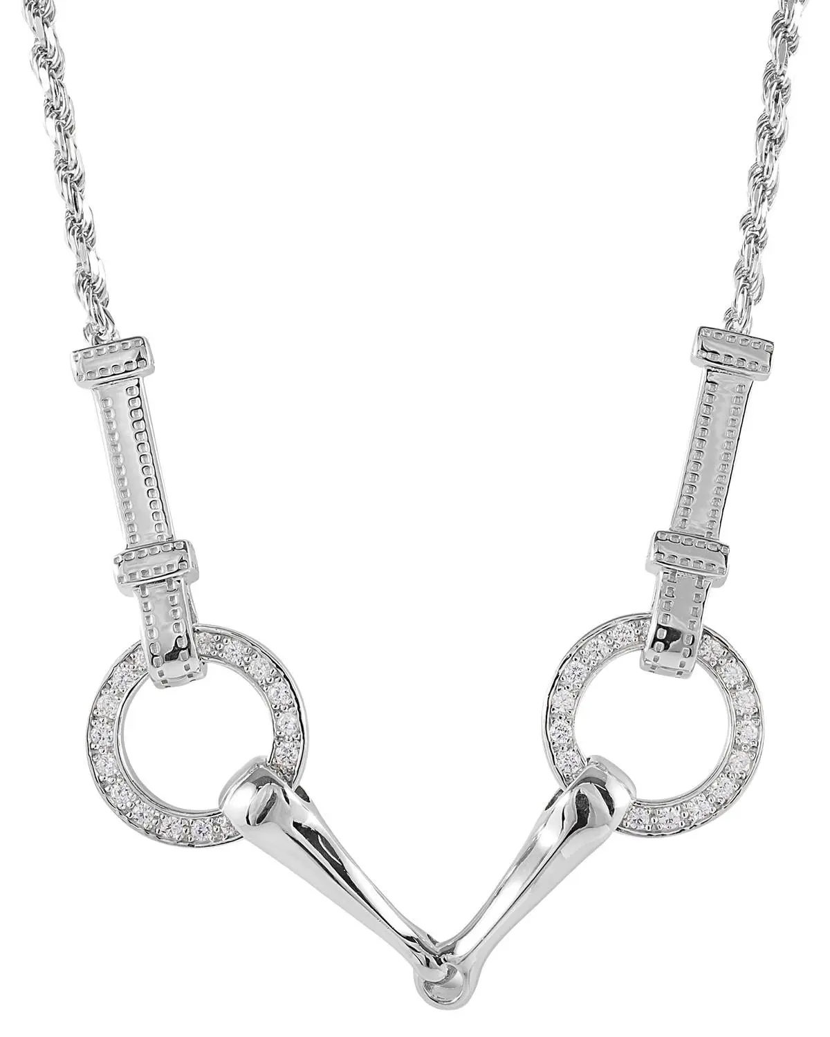 Sterling silver / 14K gold. Lobster clap closure. Snaffle bit pendant with enhanced clear CZ stones. Detailed check pieces in chain.