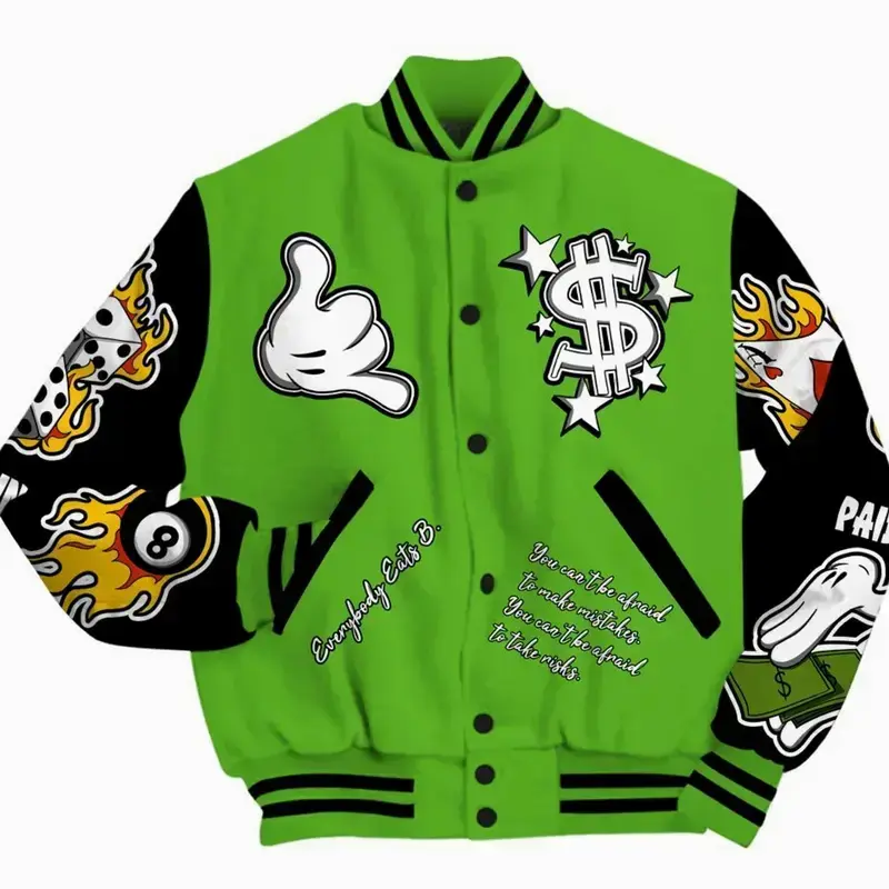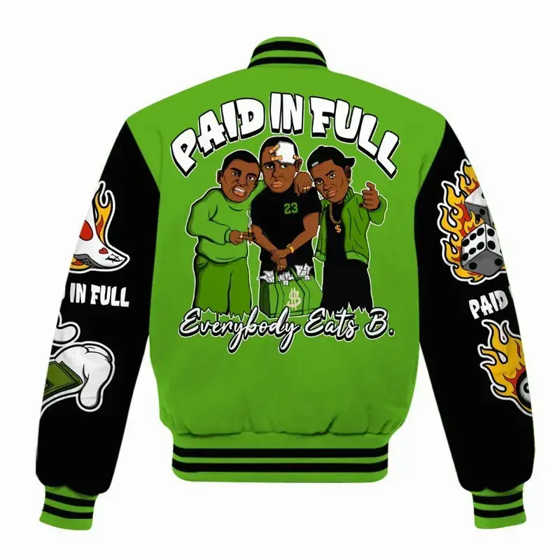 5. Varsity Jacket Match Foamposite One Volt, Everybody Paid In Full All Over Print, Unisex Streetwear Baseball Coat, Neon Sneaker Style Gear