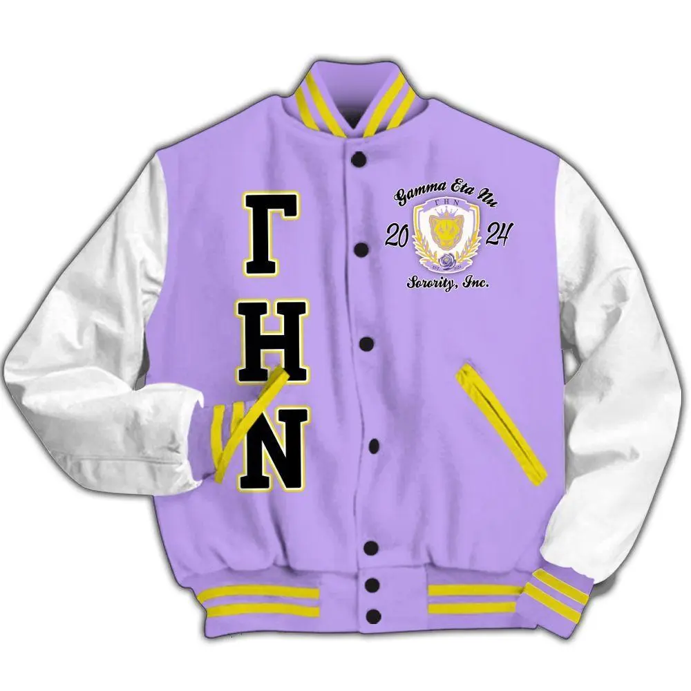 5. Gamma Eta Nu Custom Varsity Jacket, Lavender Purple White Letterman, Personalized Sisterhood Greek Life Apparel, Unique Sorority Member Outfit