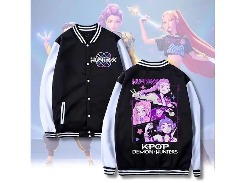 5. Demon Hunters Varsity Jacket Kpop Anime Style, Purple Harajuku Streetwear Coat, Oversized Baseball Jacket, Trendy Fan Gift