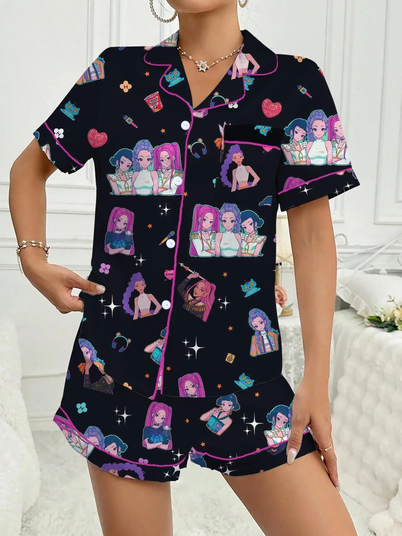 Kpop Tiger Satin Pajama Set Women, Anime Inspired Sleepwear, Short Sleeve Silky Lounge Outfit, Comfortable Gift Idea