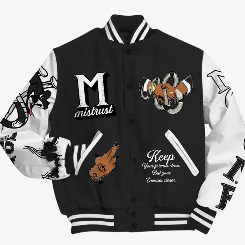 5. Varsity Jacket Match White Thunder 4s, Trust No One Snake-Bite Graphic, Unisex Streetwear Baseball Coat, Exclusive Sneaker Match Fan Gear