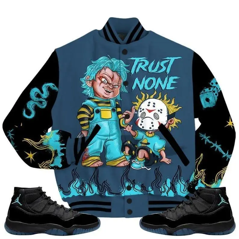 5. Gamma Blue 11s Varsity Jacket, Scary Trust No One Graffiti Print, Retro Polyester Knit Baseball Coat, Bold Sneaker Match Streetwear Style