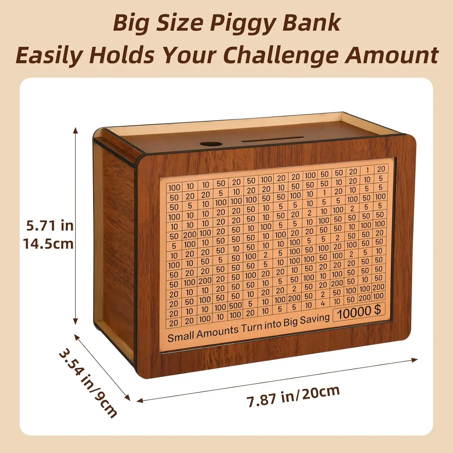 This wooden money box helps you achieve financial goals. Paste paper with your desired amount to track savings. With a max capacity of 10,000, it motivates consistent savings. Perfect for adults and kids to develop saving habits.