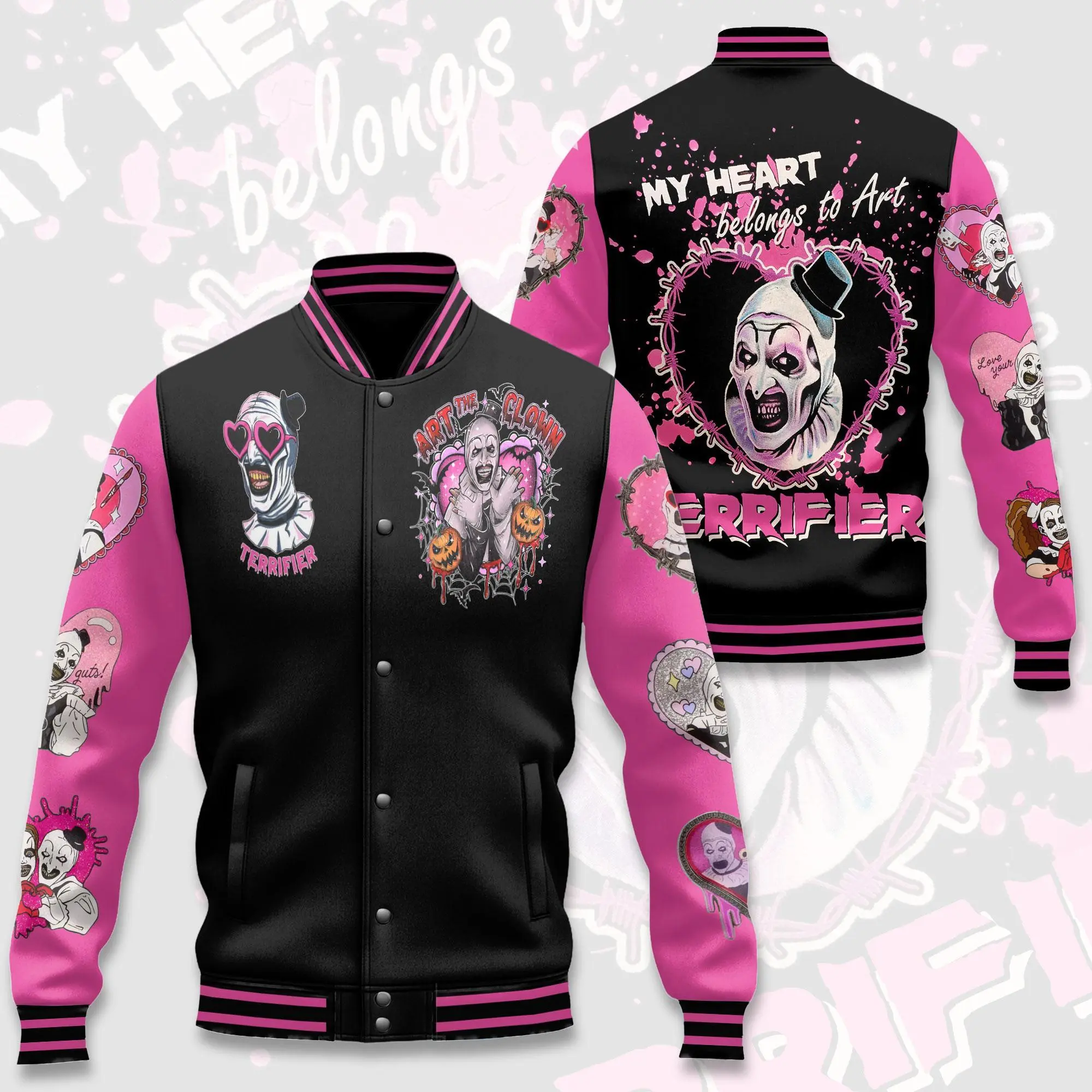 Art Horror Varsity Jacket Unisex, Pink Coquette Style Streetwear, Creepy Cute Graphic Bomber Coat, Movie Fan Gift Idea