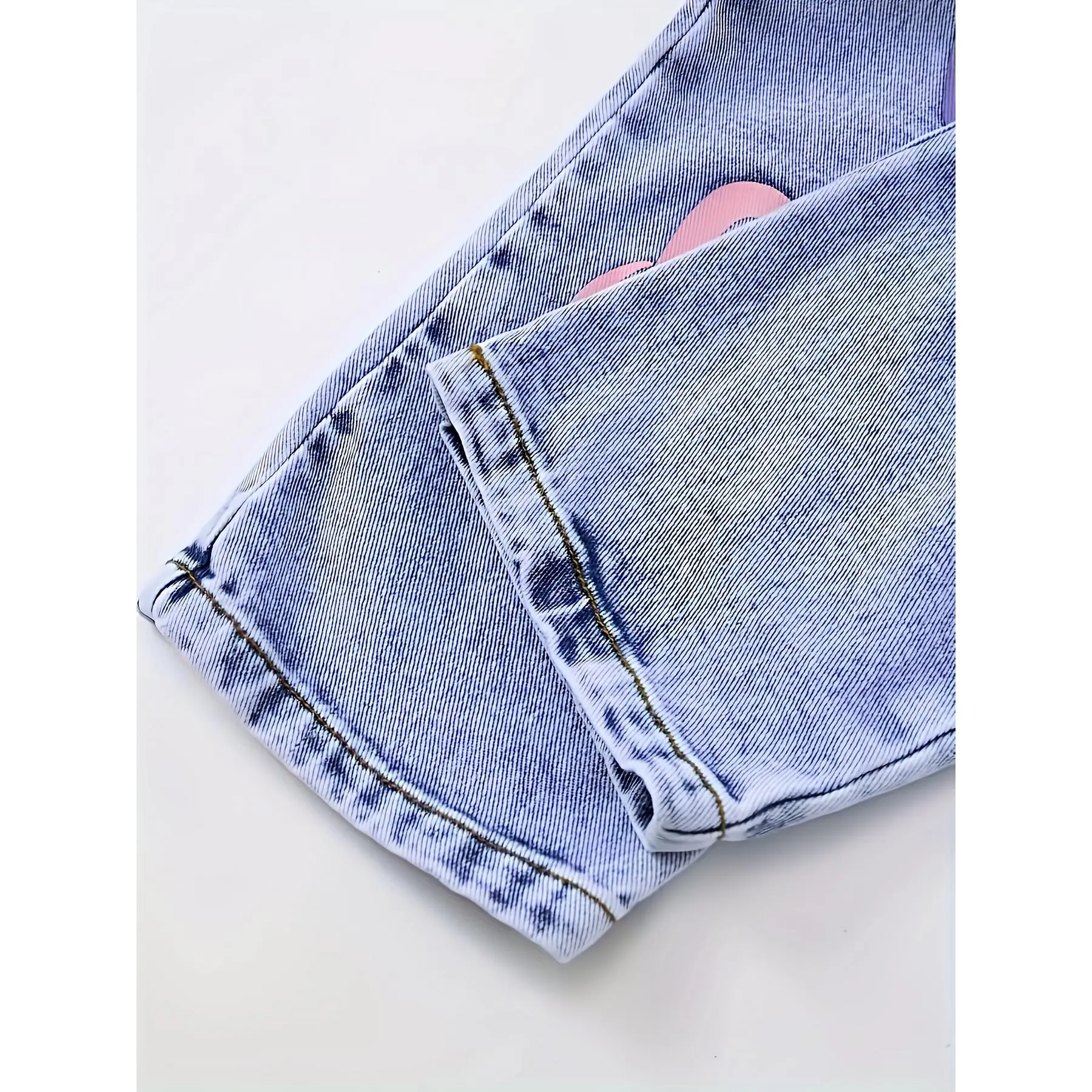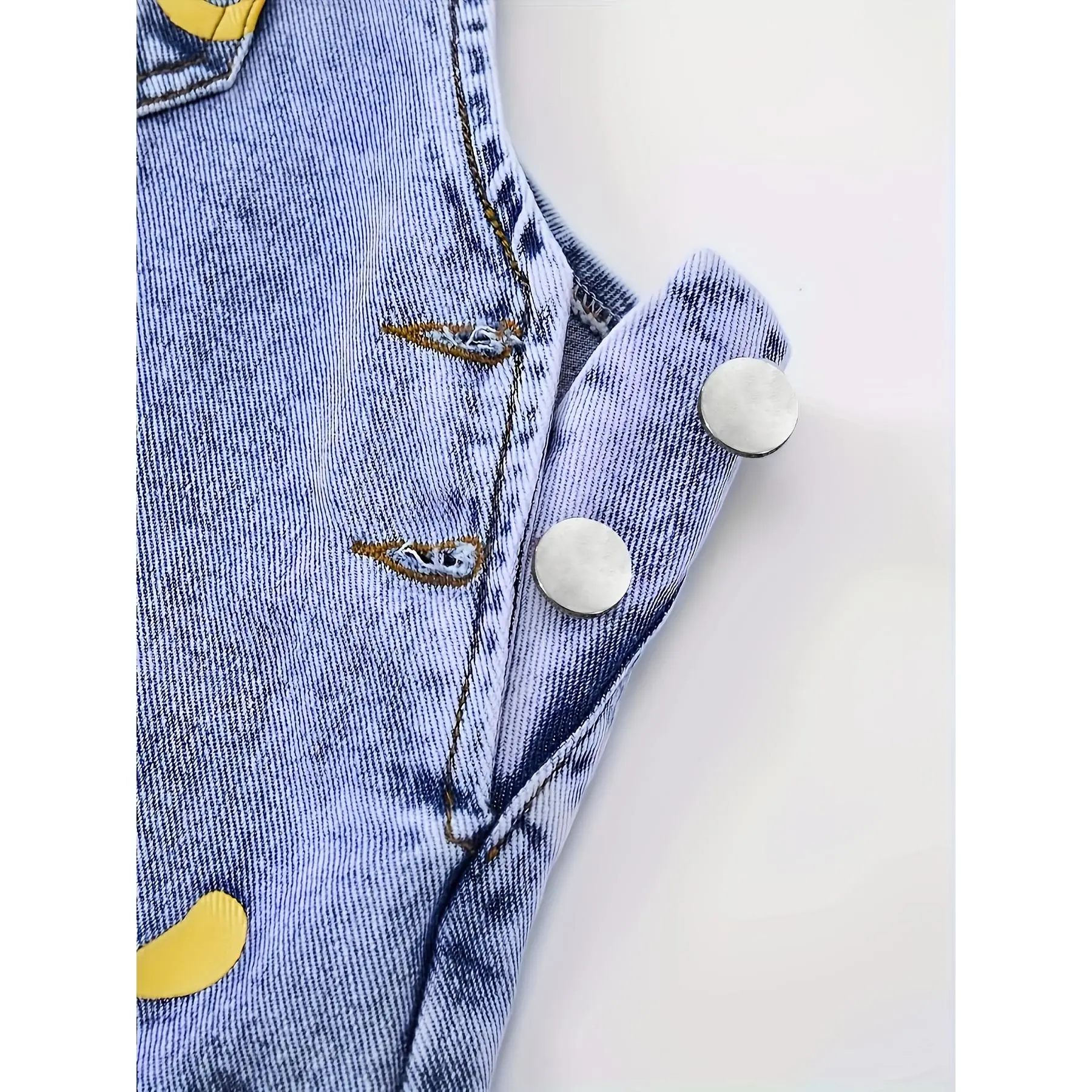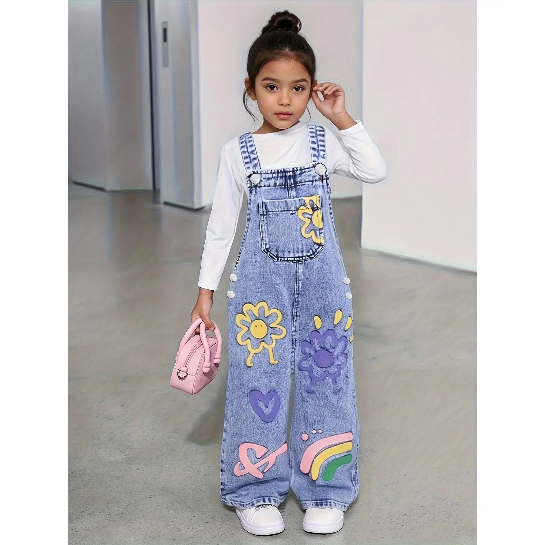 [Y2K Style Overalls] Girls' Y2K Sunflower Print Straight-Leg Loose Faux Denim Overalls with Strap - Casual Workwear Style, Elastic Waist, Pockets, Non-Stretch Fabric, Perfect For Spring/Summer/Fall, Casual Attire, Casual Attire | Y2K Style | Elastic W