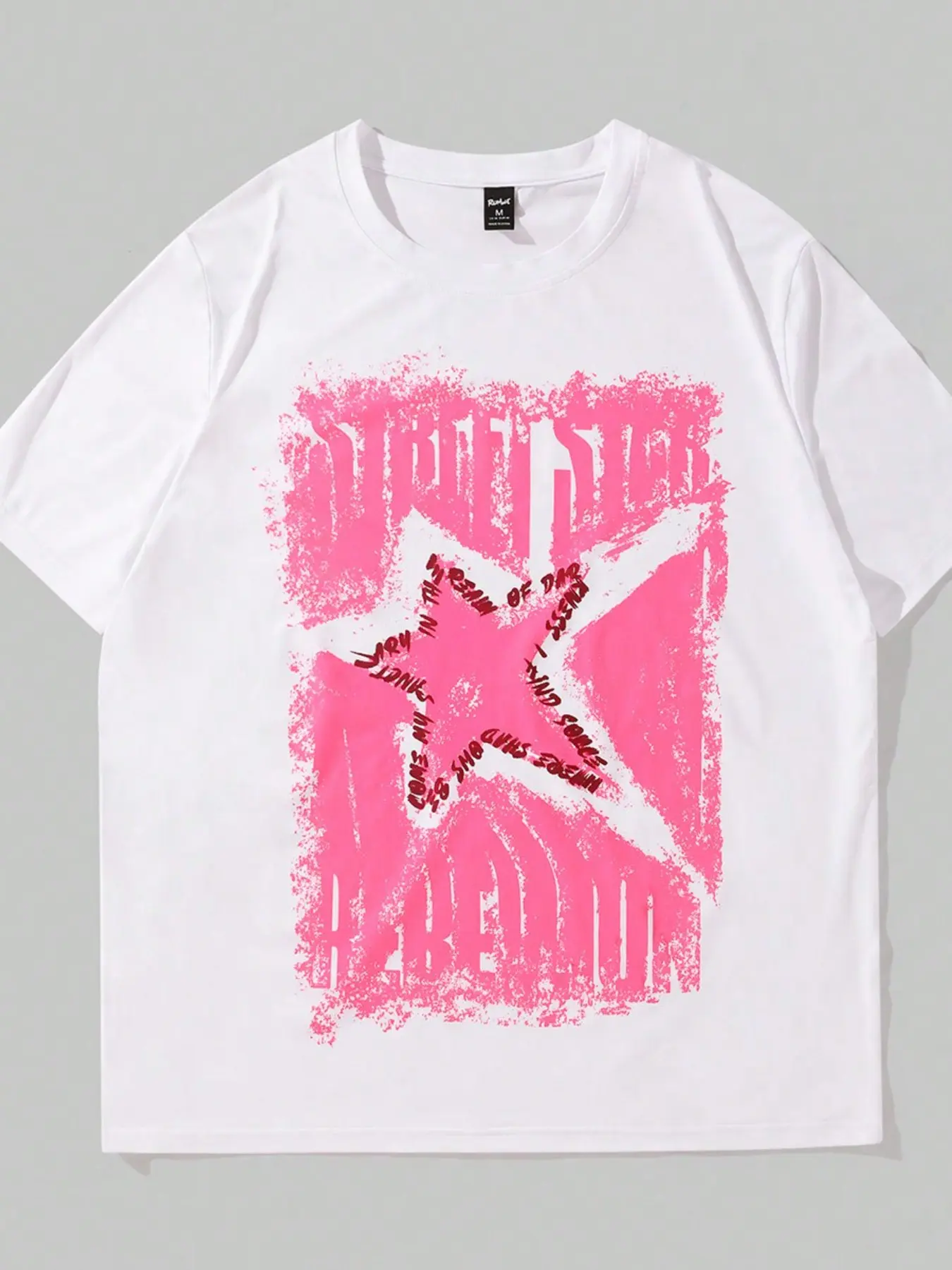 【Pink Star Pattern】: Features a unique pink star graffiti print, adding a bold and eye-catching element to the t-shirt.