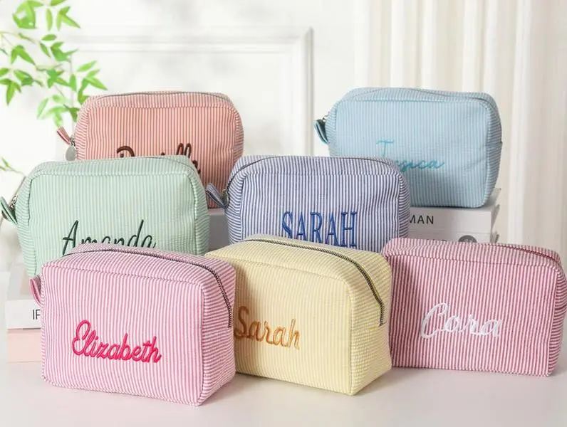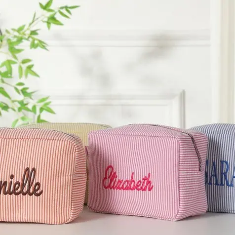 This bag is a thoughtful gift, perfect for bridesmaids. It keeps makeup and toiletries neatly stored. The seersucker material gives it a timeless appeal. Ideal for bridesmaids, it's a blend of style and functionality.