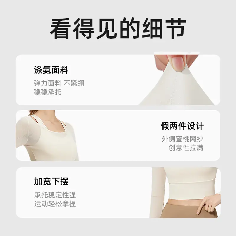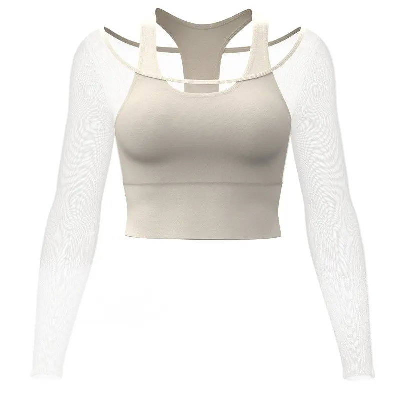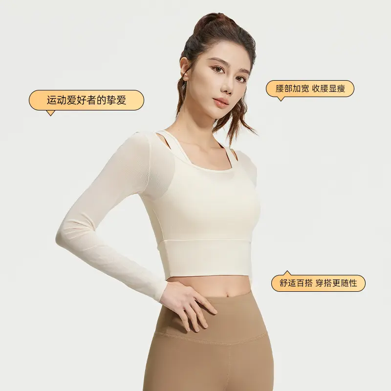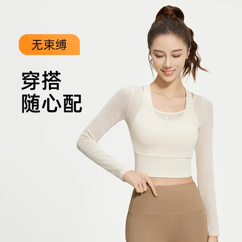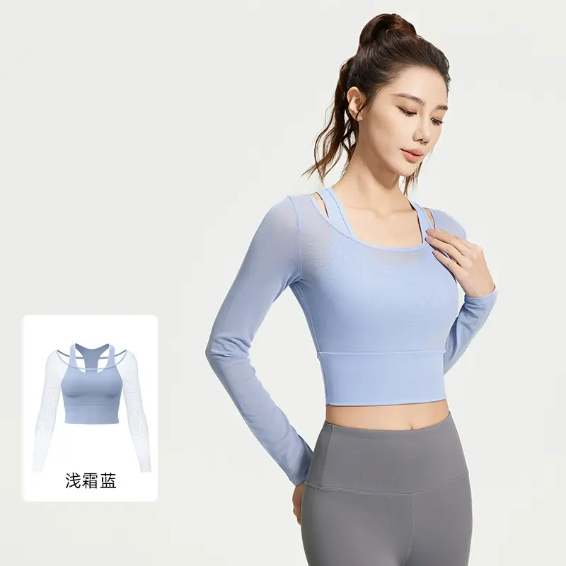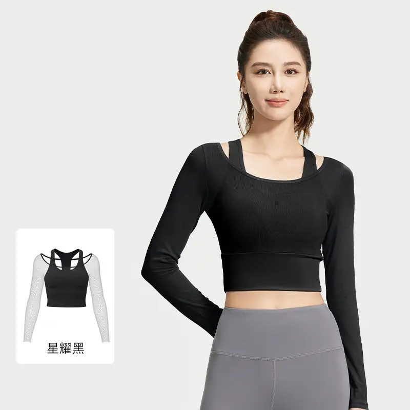 Women's Yoga Outfit for Spring and Autumn, Two-piece with Chest Pads, Long Sleeve Mesh Sheer Sports Top for Pilates Training and Fitness