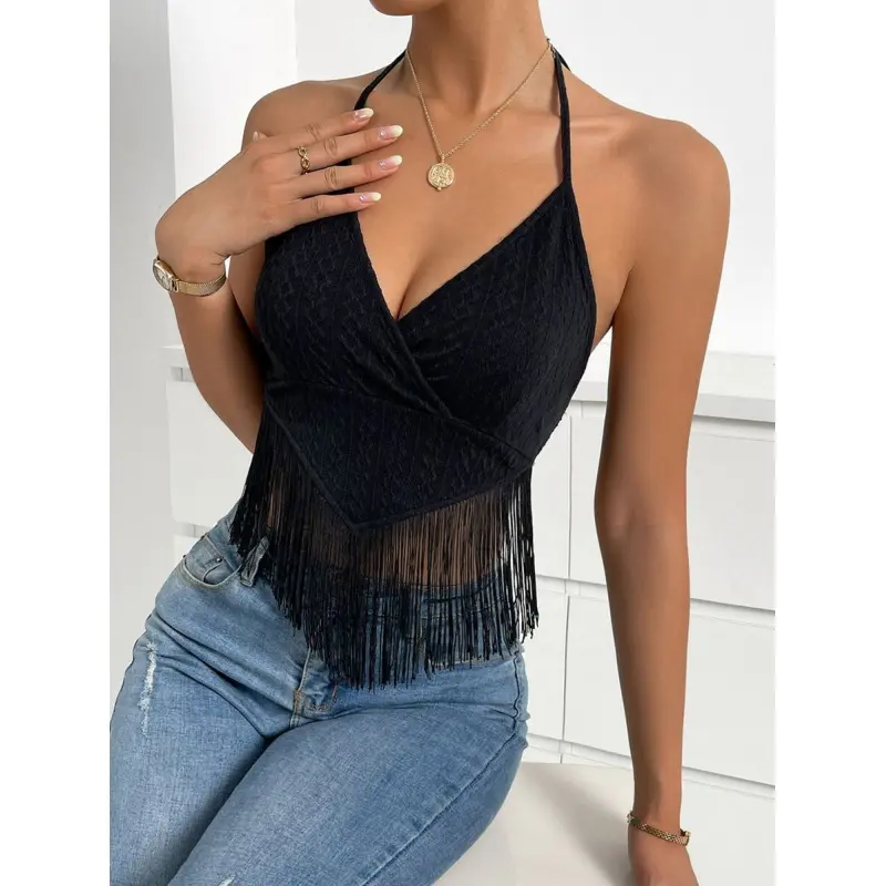 Backless Fringe Hem Halter Top, Women's Fringe Top, V-neck Slimming - Country Music Festival Outfit, Fringe Hem Bohemian Rodeo Vest, Party Vest,Black Fringe Halter Crop Top