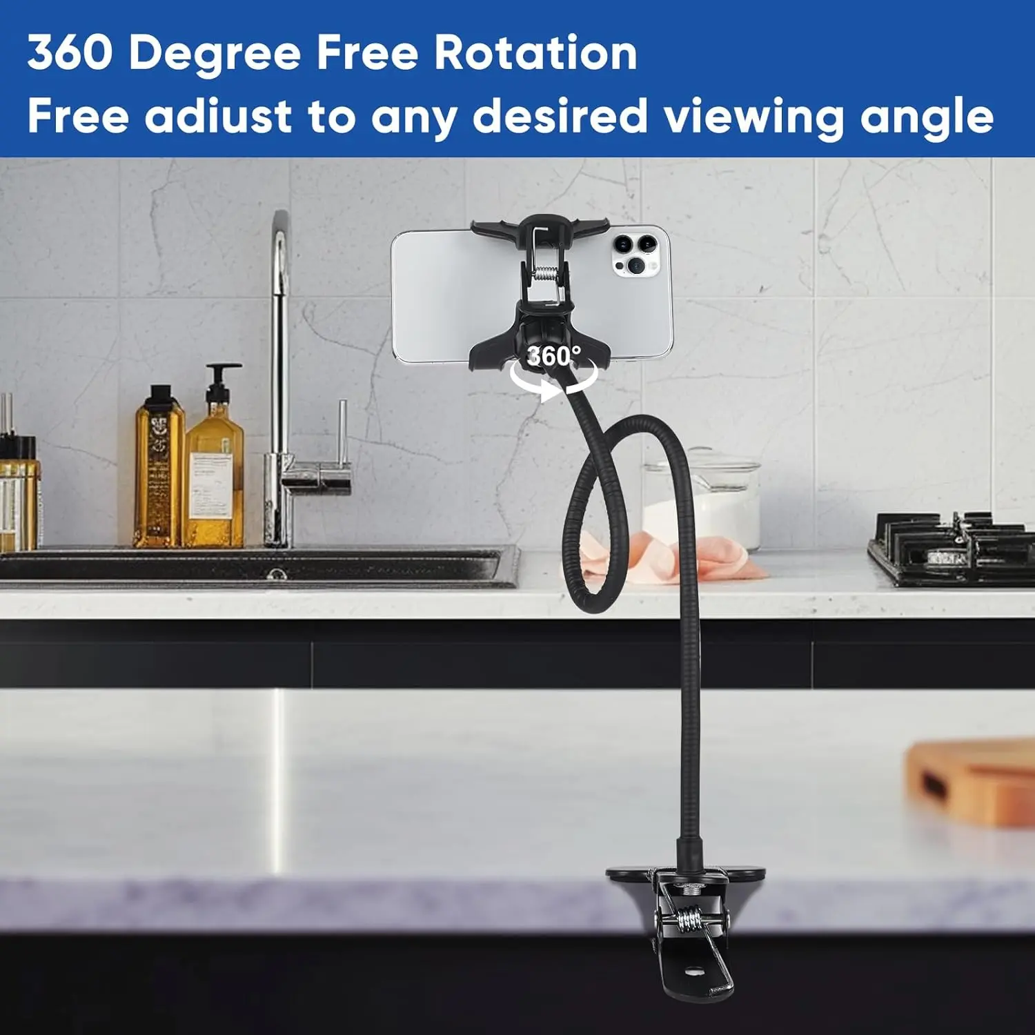 Designed with a strong clamp base and a long adjustable arm, this holder easily attaches to your bed, desk, kitchen counter, or office table. Its 360-degree rotation lets you adjust your phone to any angle for maximum comfort.