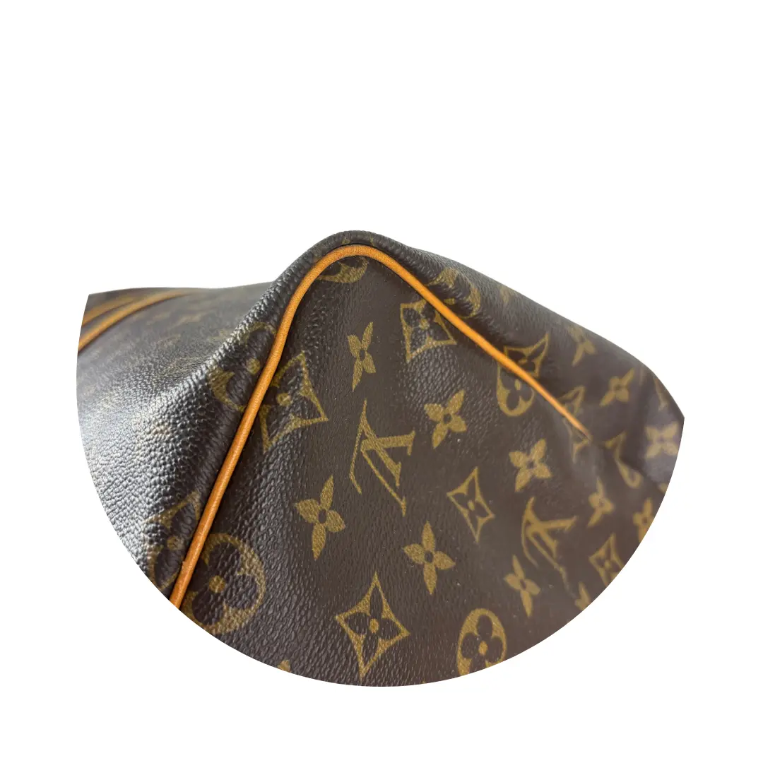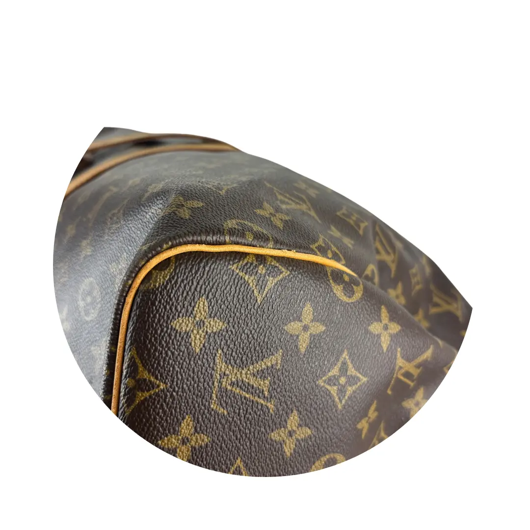 Classic LV Monogram coated canvas exterior with vachetta leather trim, brown canvas interior, and gold-tone hardware. Features removable and adjustable shoulder strap with rubber shoulder pad, handle strap, luggage tag, and lock & key. Please note light wear on leather trim as pictured. Includes certificate of authenticity. Measures 21.5” W x 11.5” H x 9.75” D, with 4.25” handle drop.Authentic vintage item circa 1988.