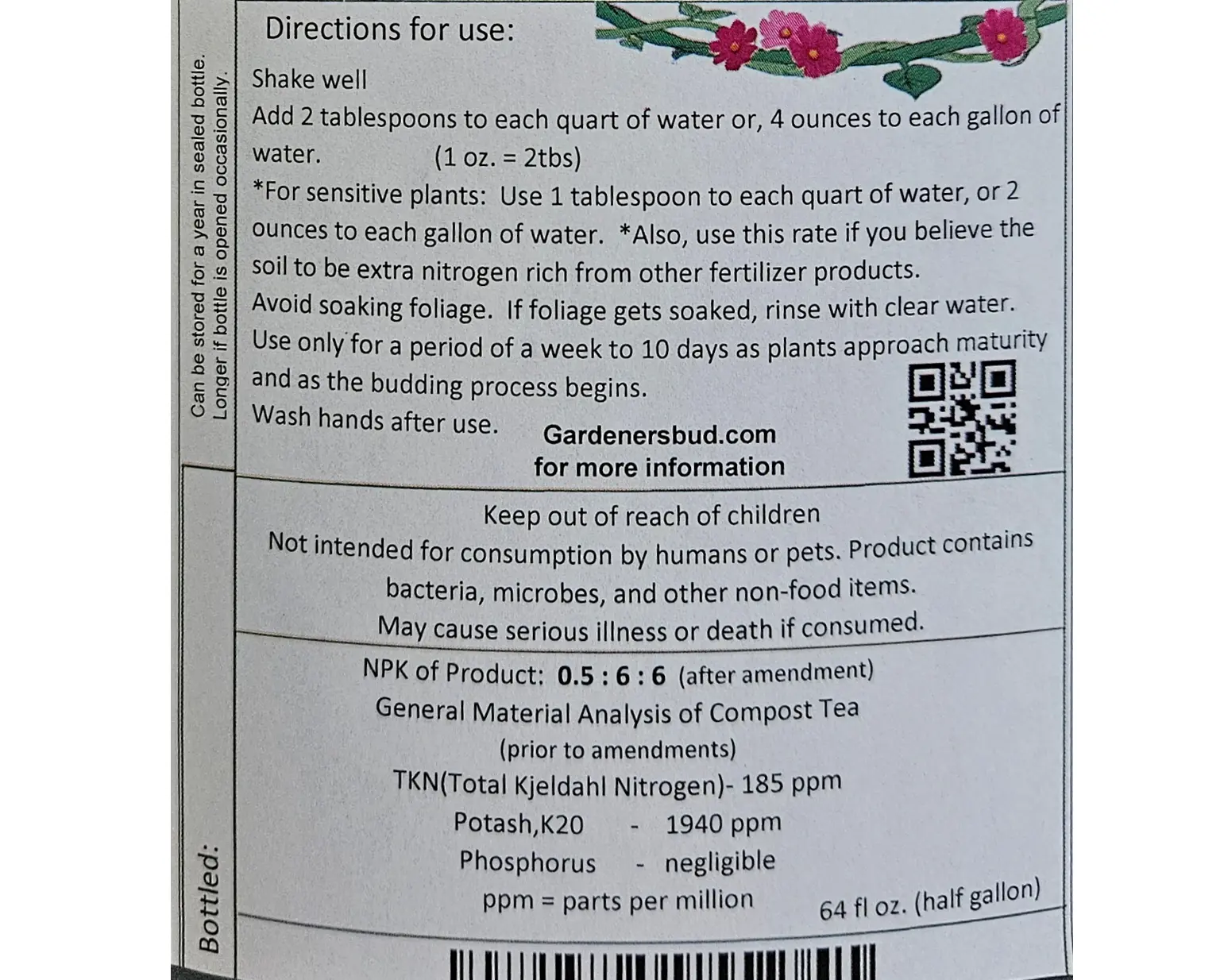 Bud and Bloom is an amended version of our Super Compost Tea. It has bone meal (organic phosphorus) and potassium sulfate added. These are the nutrients that plants need most as they reach maturity and start to produce buds and flowers. We have added a supply of these to provide what is needed to boost the quantity of buds and improve the quality of the flowers.