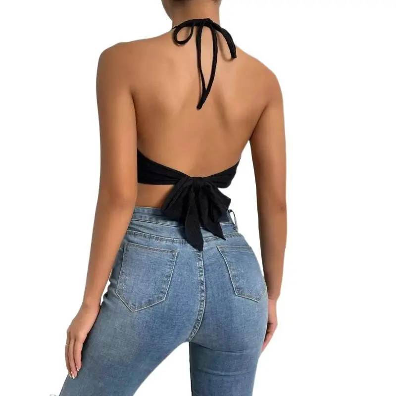 Backless Fringe Hem Halter Top, Women's Fringe Top, V-neck Slimming - Country Music Festival Outfit, Fringe Hem Bohemian Rodeo Vest, Casual sleeveless top with fringe trim, perfect for summer festivals.