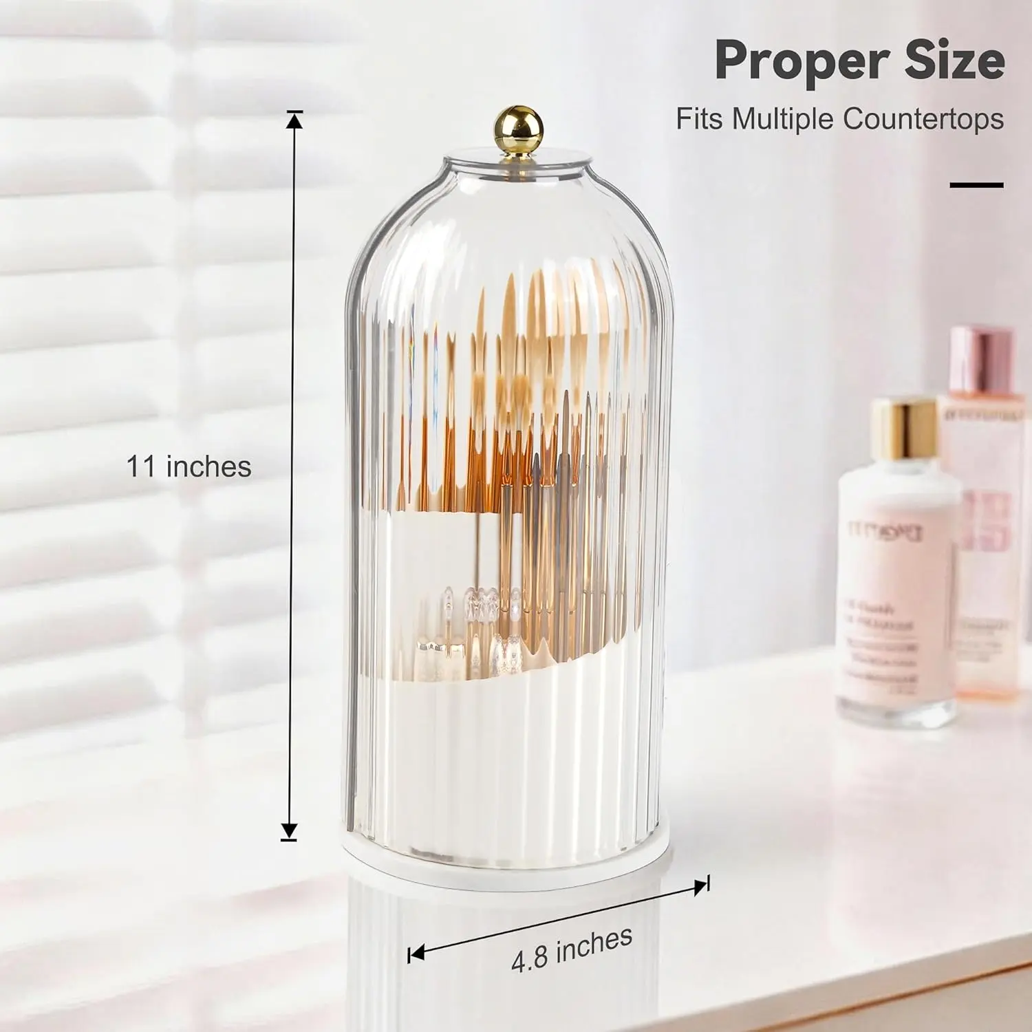 Elevate your makeup storage with this 360° rotating brush holder. It features a transparent design, making it easy to locate your brushes. The waterproof lid ensures your tools stay dry. Perfect for vanity and bathroom use, it keeps your space organized.