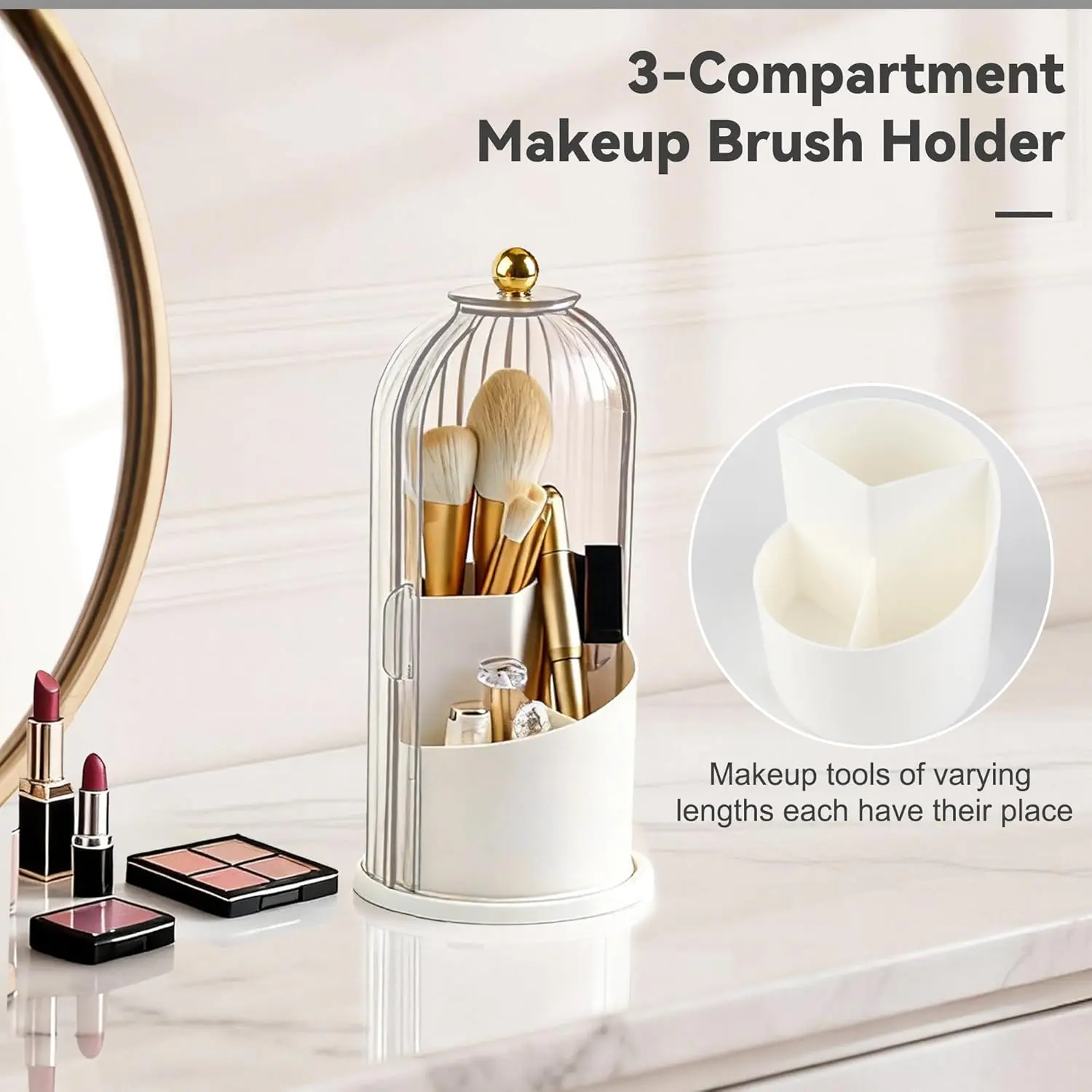 360° Rotating Makeup Brush Holder with Lid, Waterproof Three-Compartment Makeup Organizer, 180° Side-Pull Door Desk Organizer, Dustproof Brush Holder for Vanity and Bathroom (Transparent)