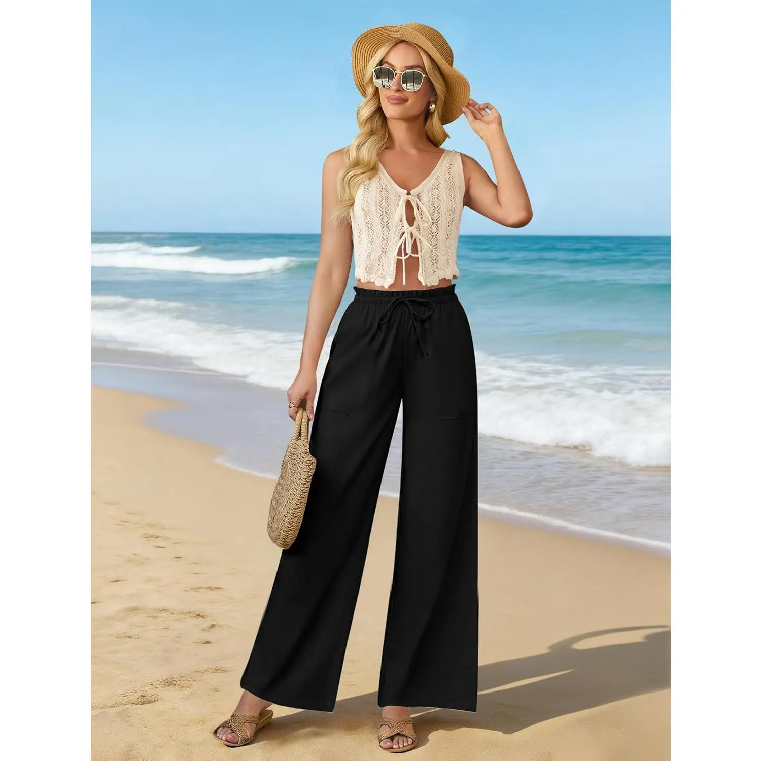 Womens Linen Wide Leg Pants, High Waisted Flowy Palazzo with Pockets Summer Drawstring Trousers Beach Travel Work