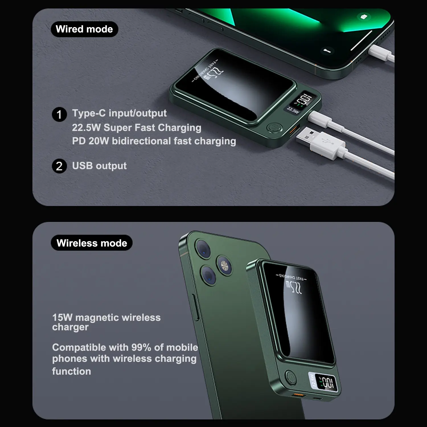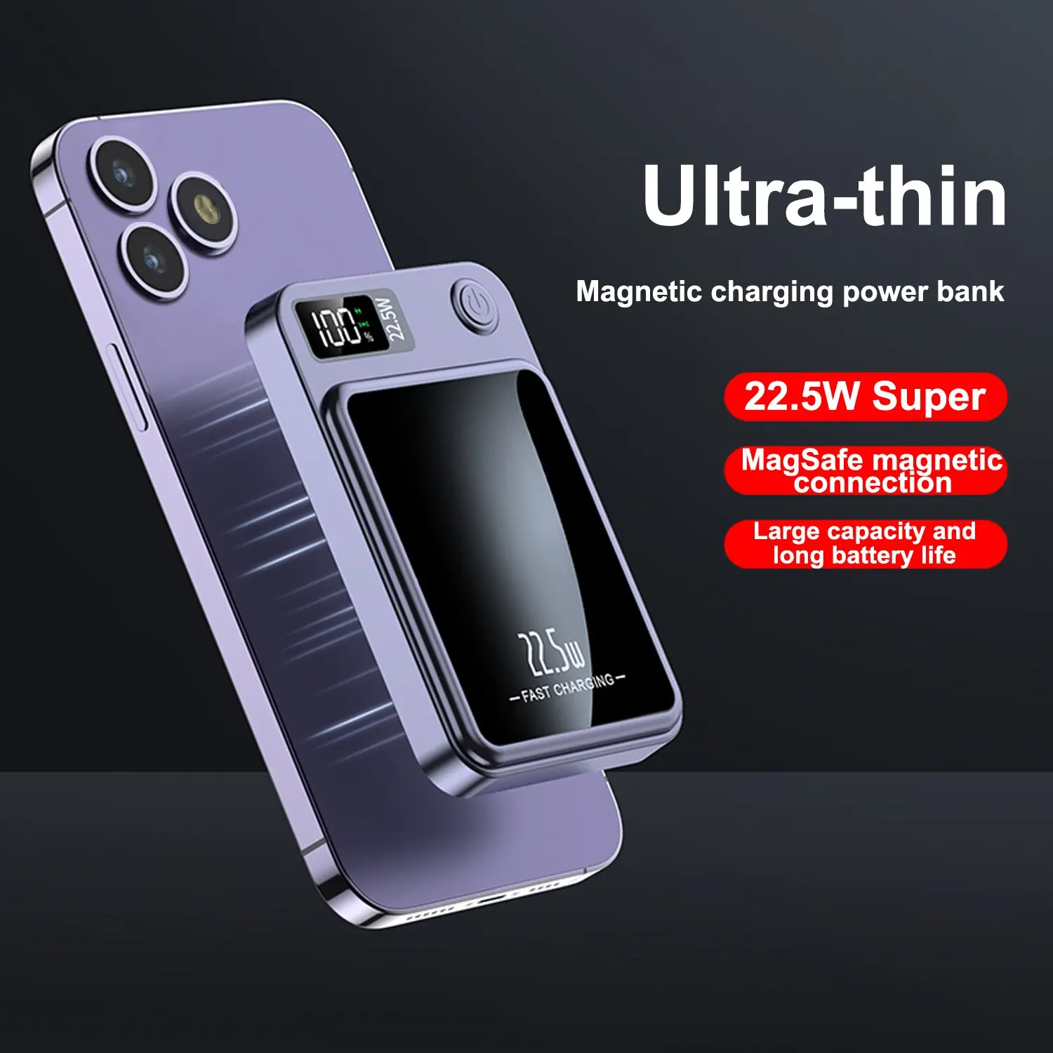 SIFOX Ultra-thin Magnetic Wireless Charging Battery 22.5W Ultra-fast Charging + 15W Magnetic Wireless Charging Type-C + USB Dual Output LED Digital Display 5000mAh Portable Power Bank for iPhone and Android Devices